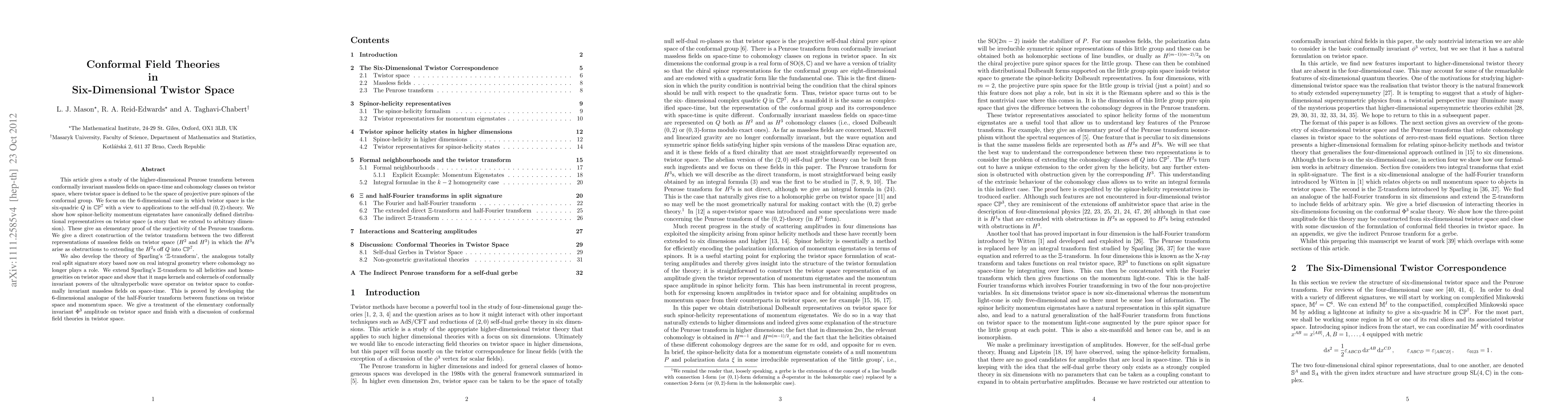 This article gives a study of the higher-dimensional Penrose transform between conformally invariant massless fields on space-time and cohomology classes on twistor space, where twistor space is defined to be the space of projective pure spinors of the conformal group. We focus on the 6-dimensional case in which twistor space is the six-quadric Q in CP^7 with a view to applications to the self-dual (0,2)-theory. We show how spinor-helicity momentum eigenstates have canonically defined distributional representatives on twistor space (a story that we extend to arbitrary dimension). These give an elementary proof of the surjectivity of the Penrose transform. We give a direct construction of the twistor transform between the two different representations of massless fields on twistor space (H^2 and H^3) in which the H^3s arise as obstructions to extending the H^2s off Q into CP^7. We also develop the theory of Sparling's `\Xi-transform', the analogous totally real split signature story based now on real integral geometry where cohomology no longer plays a role. We extend Sparling's \Xi-transform to all helicities and homogeneities on twistor space and show that it maps kernels and cokernels of conformally invariant powers of the ultrahyperbolic wave operator on twistor space to conformally invariant massless fields on space-time. This is proved by developing the 6-dimensional analogue of the half-Fourier transform between functions on twistor space and momentum space. We give a treatment of the elementary conformally invariant \Phi^3 amplitude on twistor space and finish with a discussion of conformal field theories in twistor space.