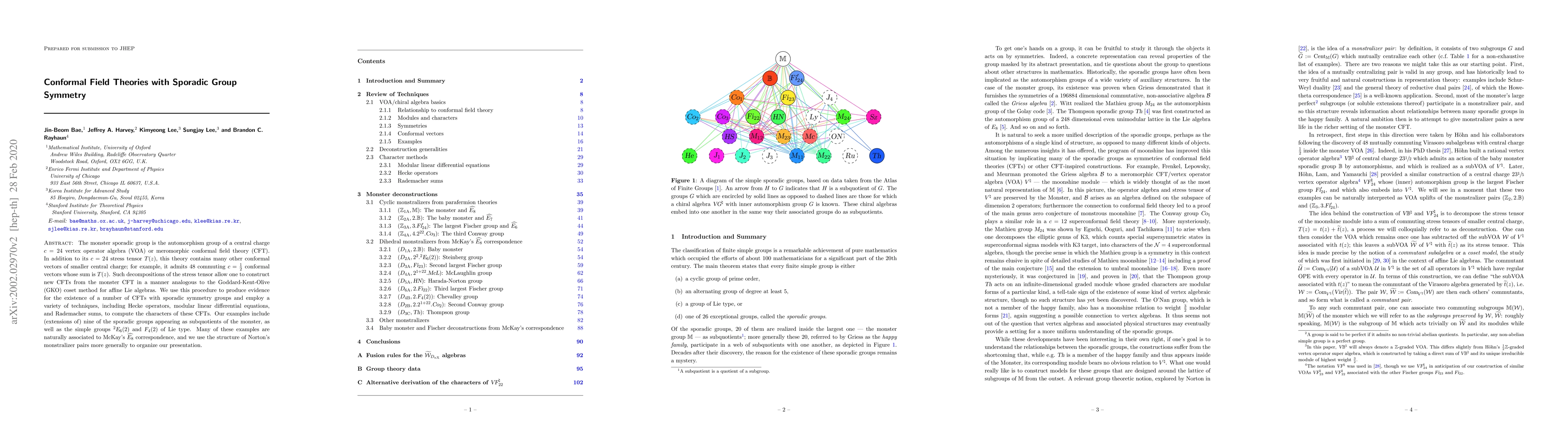 This paper explores conformal field theories (CFTs) with sporadic group symmetries, particularly focusing on the monster group and its decompositions. It constructs new CFTs using the GKO coset method and employs advanced techniques to compute their characters, revealing examples of CFTs associated with various sporadic and Lie groups.
