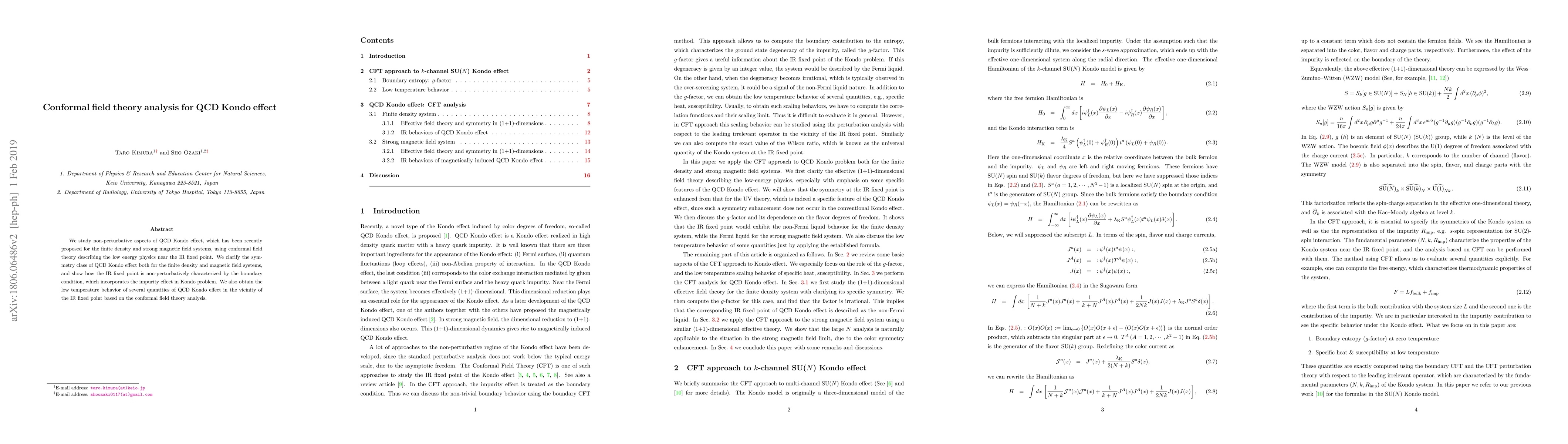The paper presents a CFT analysis of the QCD Kondo effect, characterizing the IR fixed point with a boundary condition and deriving low-temperature behaviors of various quantities, which extends the conventional Kondo model to the non-perturbative regime relevant to QCD.