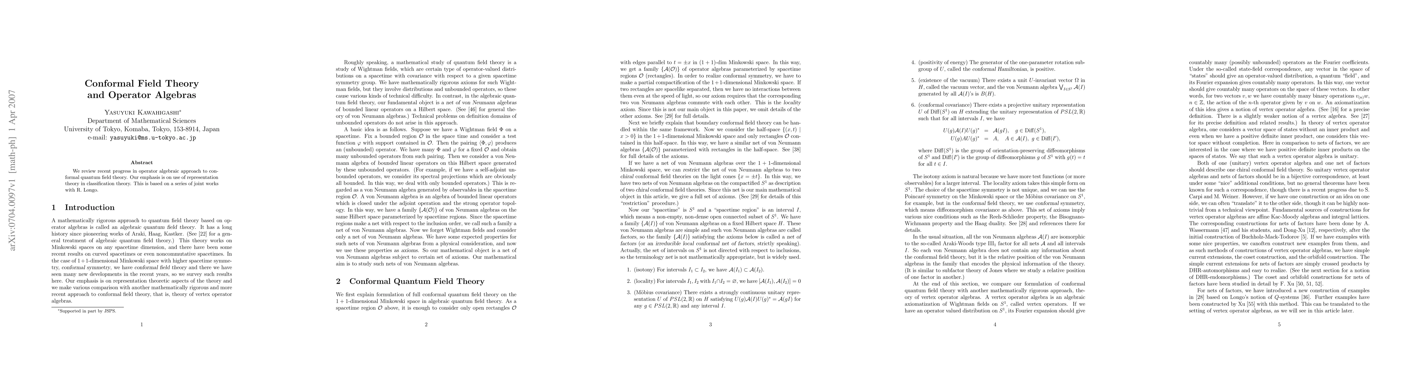 Summary: This paper reviews advancements in applying operator algebras to conformal quantum field theory, focusing on representation theory for classification. The work is a collaborative effort with R. Longo.
