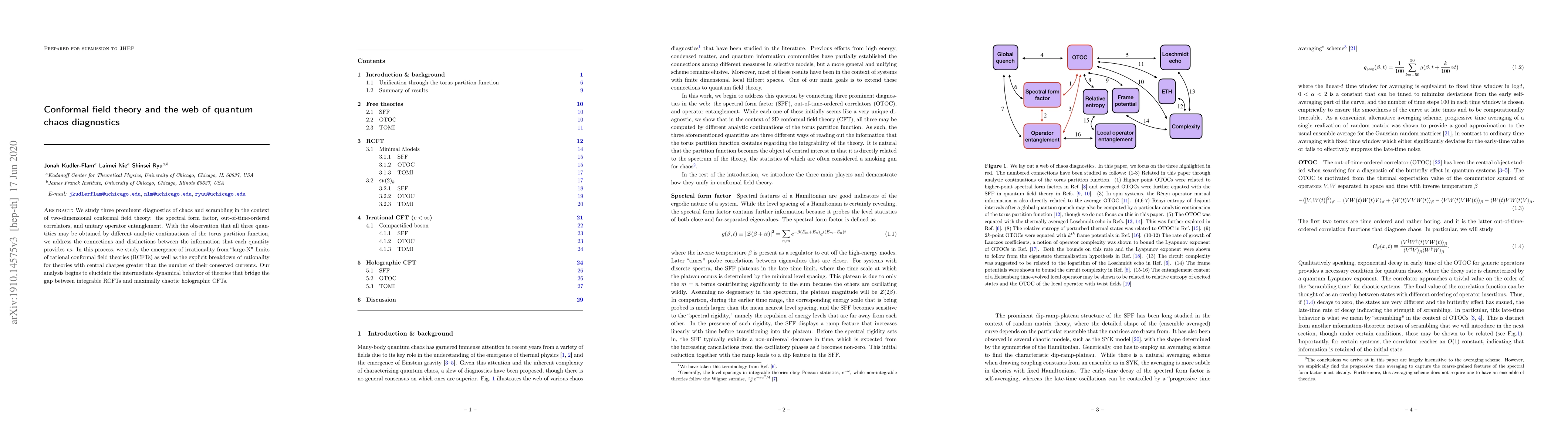 We study three prominent diagnostics of chaos and scrambling in the context of two-dimensional conformal field theory: the spectral form factor, out-of-time-ordered correlators, and unitary operator entanglement. With the observation that all three quantities may be obtained by different analytic continuations of the torus partition function, we address the connections and distinctions between the information that each quantity provides us. In this process, we study the emergence of irrationality from "large-N" limits of rational conformal field theories (RCFTs) as well as the explicit breakdown of rationality for theories with central charges greater than the number of their conserved currents. Our analysis begins to elucidate the intermediate dynamical behavior of theories that bridge the gap between integrable RCFTs and maximally chaotic holographic CFTs.