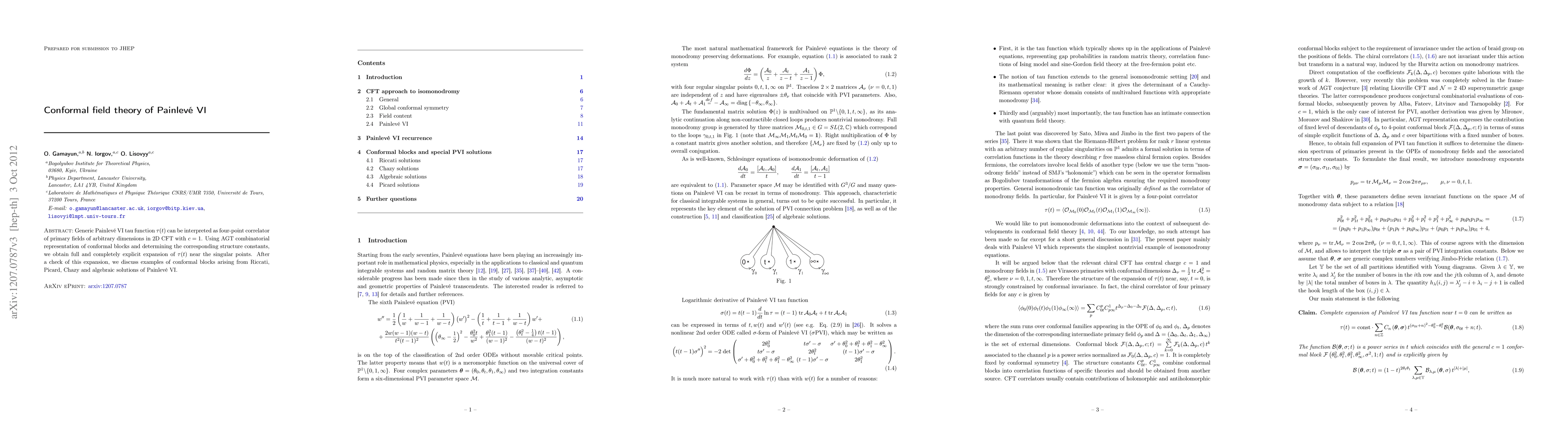 The paper presents a detailed analysis of the Painlevé VI tau function using conformal field theory, leading to an explicit expansion near singular points and identification of the tau function as a correlator of monodromy fields.