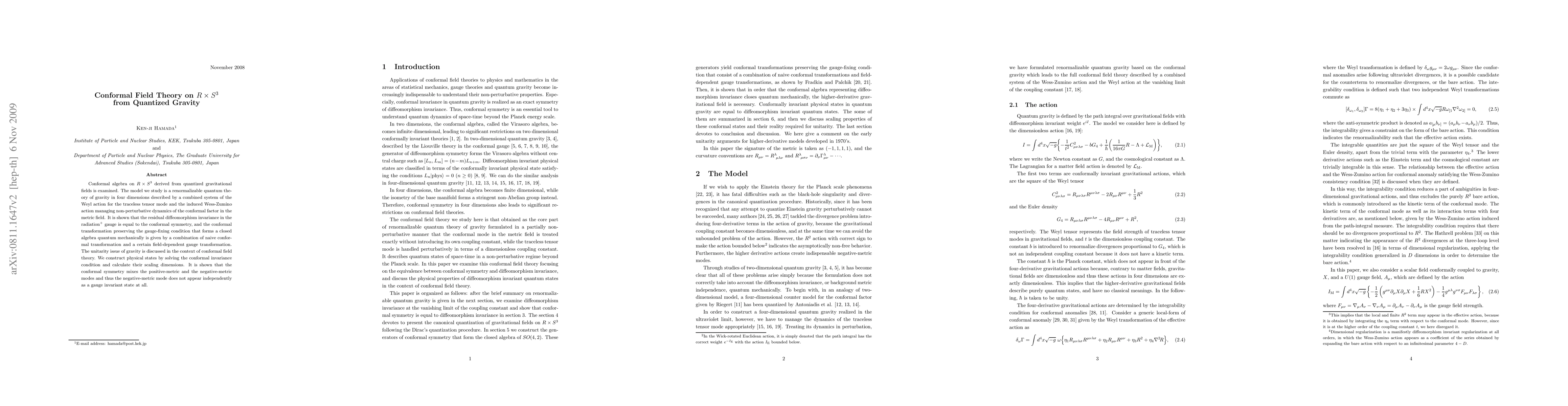 This paper explores conformal field theory on R x S^3 derived from quantized gravity, demonstrating that residual diffeomorphism invariance equates to conformal symmetry in the radiation^+ gauge. It constructs physical states by solving conformal invariance conditions, revealing that the conformal symmetry blends positive-metric and negative-metric modes, eliminating independent negative-metric gauge invariant states.
