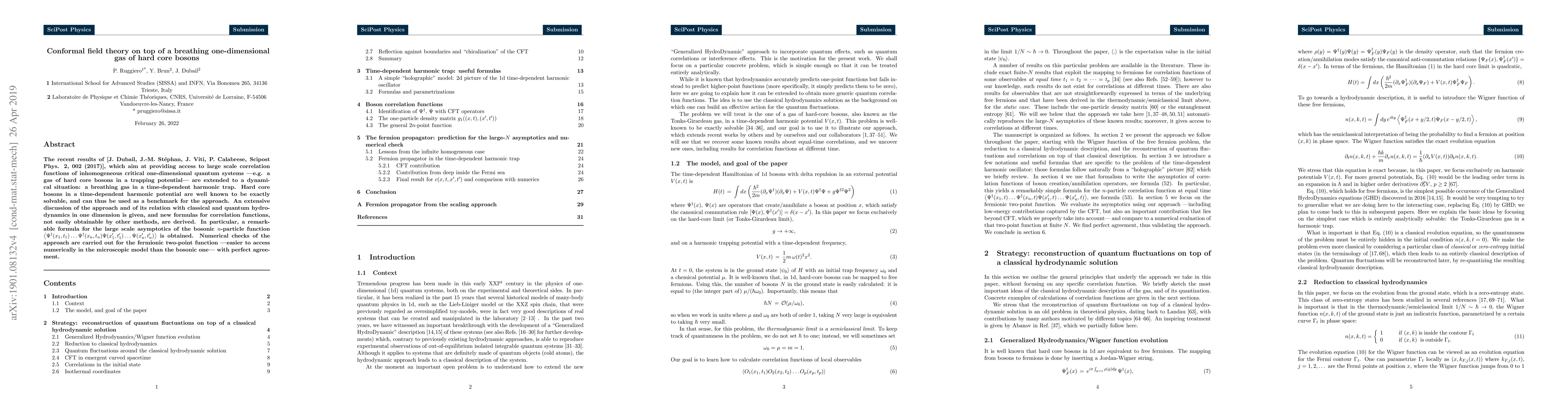 The recent results of [J. Dubail, J.-M. St\'ephan, J. Viti, P. Calabrese, Scipost Phys. 2, 002 (2017)], which aim at providing access to large scale correlation functions of inhomogeneous critical one-dimensional quantum systems -- e.g. a gas of hard core bosons in a trapping potential -- are extended to a dynamical situation: a breathing gas in a time-dependent harmonic trap. Hard core bosons in a time-dependent harmonic potential are well known to be exactly solvable, and can thus be used as a benchmark for the approach. An extensive discussion of the approach and of its relation with classical and quantum hydrodynamics in one dimension is given, and new formulas for correlation functions, not easily obtainable by other methods, are derived. In particular, a remarkable formula for the large scale asymptotics of the bosonic $n$-particle function $\left< \Psi^\dagger (x_1,t_1) \dots \Psi^\dagger (x_n,t_n) \Psi(x_1',t_1') \dots \Psi(x_n',t_n') \right>$ is obtained. Numerical checks of the approach are carried out for the fermionic two-point function -- easier to access numerically in the microscopic model than the bosonic one -- with perfect agreement.