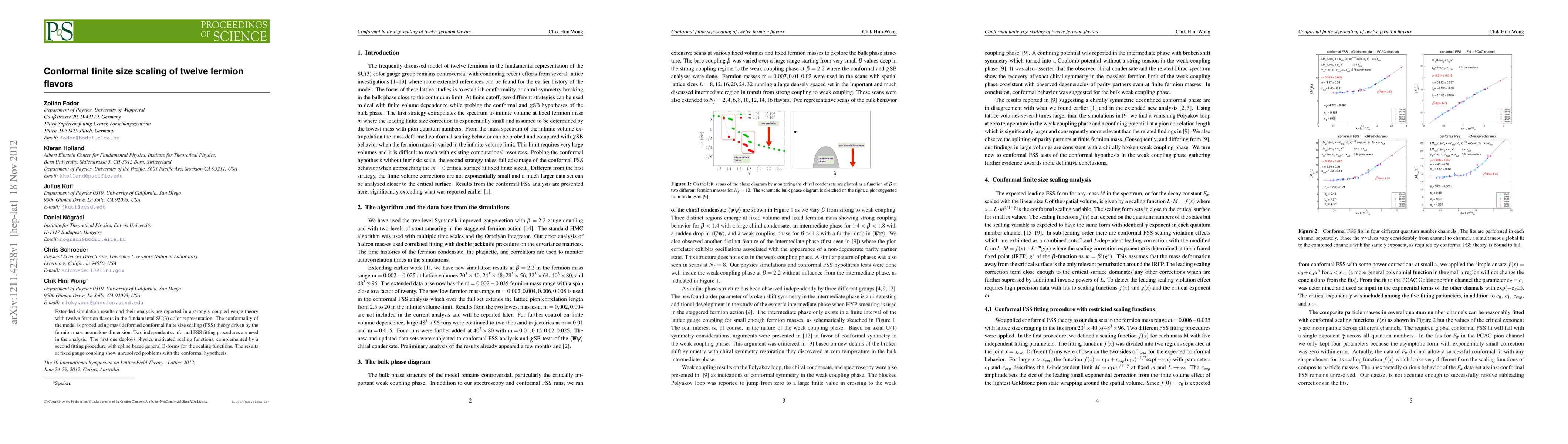 The paper presents extended lattice simulation results and their analysis using two independent conformal FSS fitting procedures, significantly extending previous work on twelve fermion flavors in the SU(3) gauge theory.