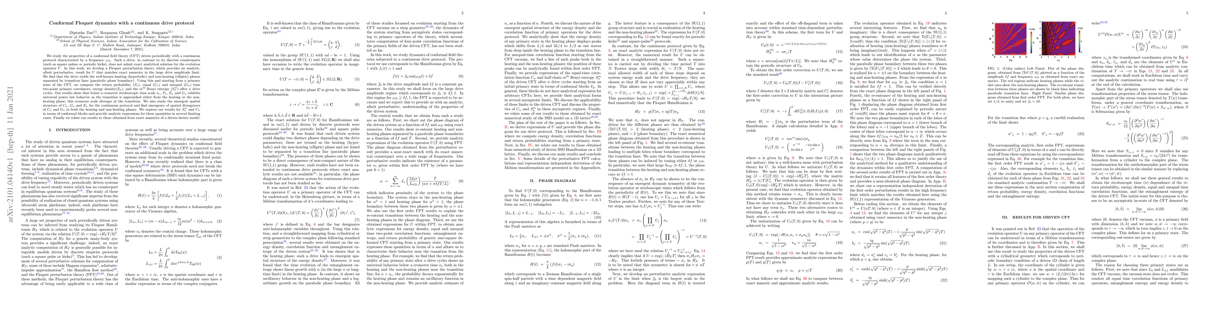 We study the properties {of a conformal field theory} (CFT) driven periodically with a continuous protocol characterized by a frequency $\omega_D$. Such a drive, in contrast to its discrete counterparts (such as square pulses or periodic kicks), does not admit exact analytical solution for the evolution operator $U$. In this work, we develop a Floquet perturbation theory which provides an analytic, albeit perturbative, result for $U$ that matches exact numerics in the large drive amplitude limit. We find that the drive yields the well-known heating (hyperbolic) and non-heating (elliptic) phases separated by transition lines (parabolic phase boundary). Using this and starting from a primary state of the CFT, we compute the return probability ($P_n$), equal ($C_n$) and unequal ($G_n$) time two-point primary correlators, energy density($E_n$), and the $m^{\rm th}$ Renyi entropy ($S_n^m$) after $n$ drive cycles. Our results show that below a crossover stroboscopic time scale $n_c$, $P_n$, $E_n$ and $G_n$ exhibits universal power law behavior as the transition is approached either from the heating or the non-heating phase; this crossover scale diverges at the transition. We also study the emergent spatial structure of $C_n$, $G_n$ and $E_n$ for the continuous protocol and find emergence of spatial divergences of $C_n$ and $G_n$ in both the heating and non-heating phases. We express our results for $S_n^m$ and $C_n$ in terms of conformal blocks and provide analytic expressions for these quantities in several limiting cases. Finally we relate our results to those obtained from exact numerics of a driven lattice model.
