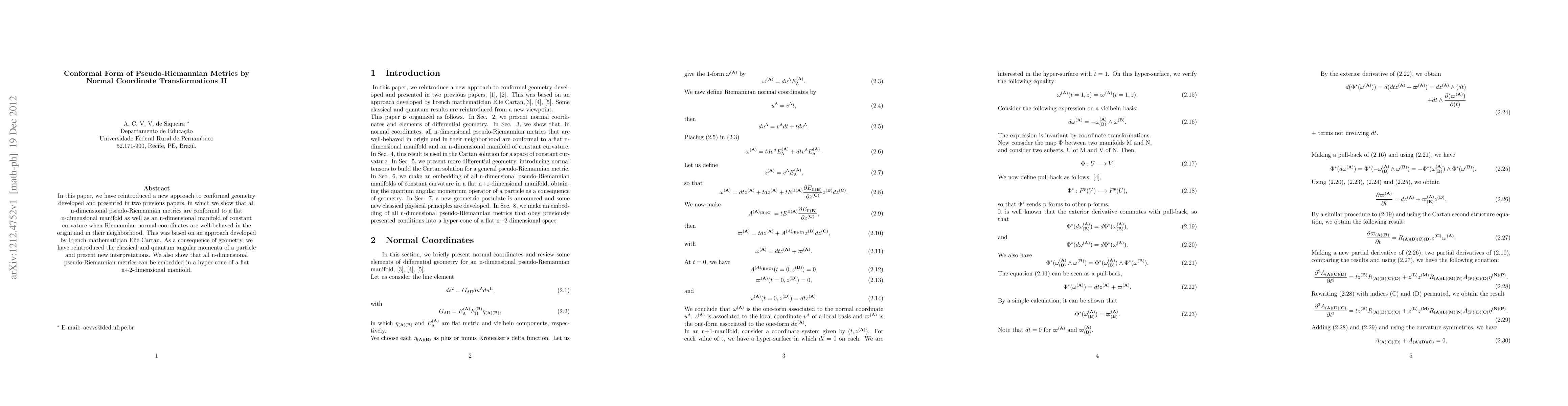 In this paper, we have reintroduced a new approach to conformal geometry developed and presented in two previous papers, in which we show that all n-dimensional pseudo-Riemannian metrics are conformal to a flat n-dimensional manifold as well as an n-dimensional manifold of constant curvature when Riemannian normal coordinates are well-behaved in the origin and in their neighborhood. This was based on an approach developed by French mathematician Elie Cartan. As a consequence of geometry, we have reintroduced the classical and quantum angular momenta of a particle and present new interpretations. We also show that all n-dimensional pseudo-Riemannian metrics can be embedded in a hyper-cone of a flat n+2-dimensional manifold.