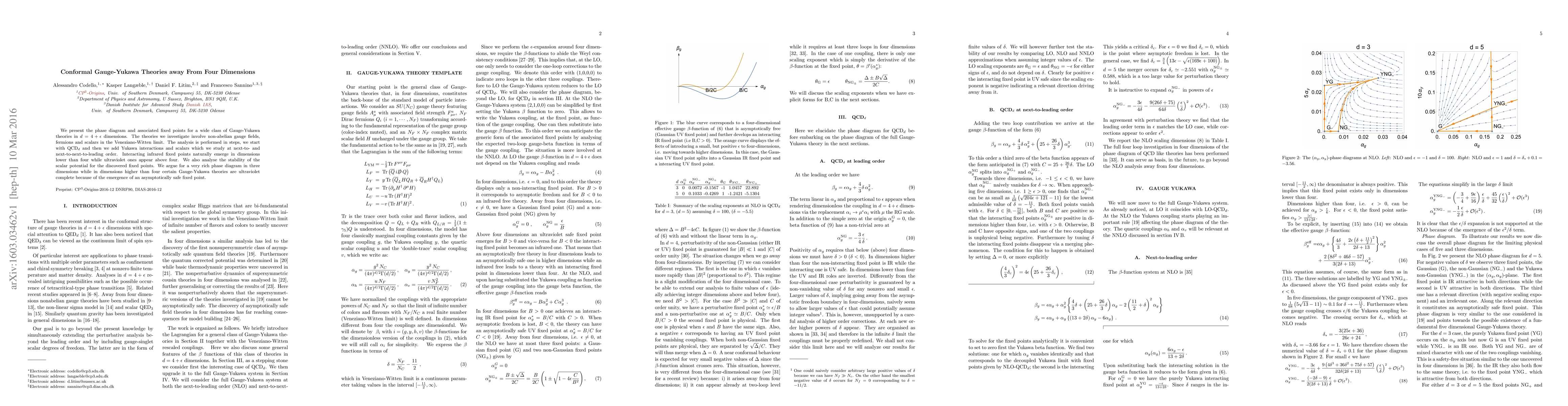 We present the phase diagram and associated fixed points for a wide class of Gauge-Yukawa theories in $d=4+\epsilon$ dimensions. The theories we investigate involve non-abelian gauge fields, fermions and scalars in the Veneziano-Witten limit. The analysis is performed in steps, we start with QCD$_d$ and then we add Yukawa interactions and scalars which we study at next-to- and next-to-next-to-leading order. Interacting infrared fixed points naturally emerge in dimensions lower than four while ultraviolet ones appear above four. We also analyse the stability of the scalar potential for the discovered fixed points. We argue for a very rich phase diagram in three dimensions while in dimensions higher than four certain Gauge-Yukawa theories are ultraviolet complete because of the emergence of an asymptotically safe fixed point.