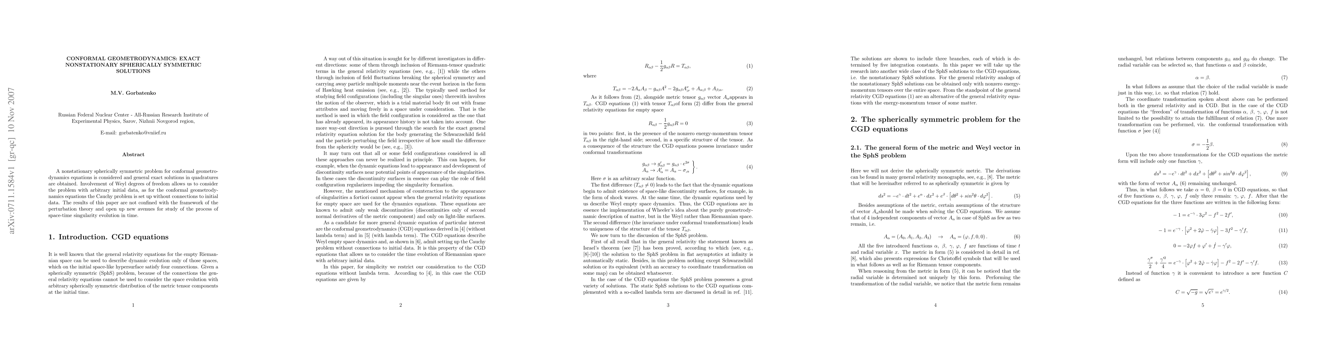This paper presents exact nonstationary spherically symmetric solutions for conformal geometrodynamics equations, utilizing Weyl degrees of freedom to handle arbitrary initial data. These findings extend beyond perturbation theory, offering new insights into the evolution of space-time singularities.