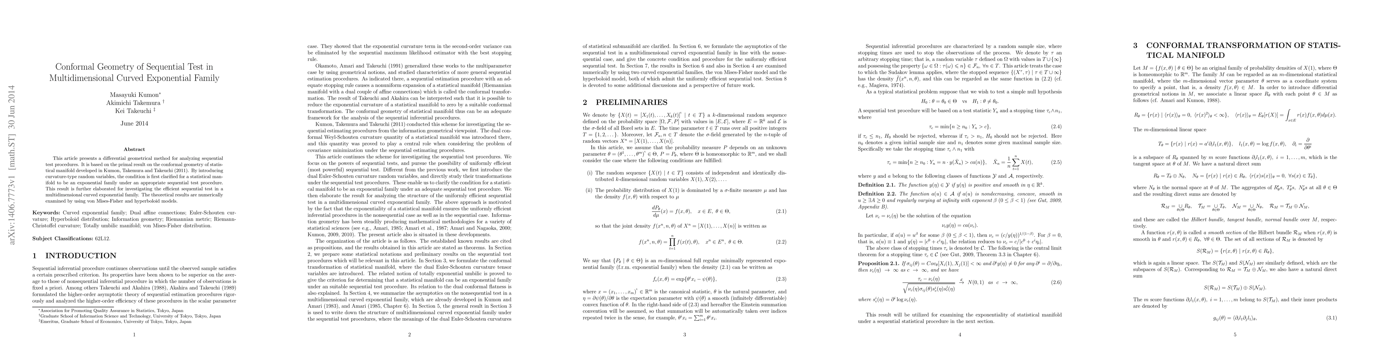The paper presents a differential geometrical method for analyzing sequential test procedures in multidimensional curved exponential families, leveraging the conformal geometry of statistical manifolds.