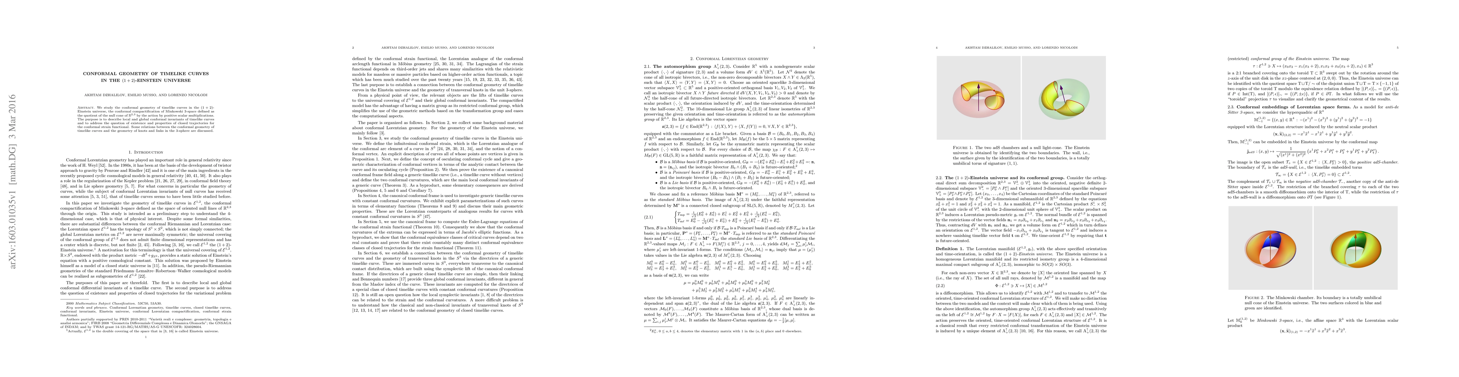 This paper investigates the conformal geometry of timelike curves in the (1+2)-Einstein universe, focusing on local and global conformal invariants and the existence of closed trajectories for the conformal strain functional. It also explores connections between the geometry of timelike curves and the geometry of knots and links in the 3-sphere.