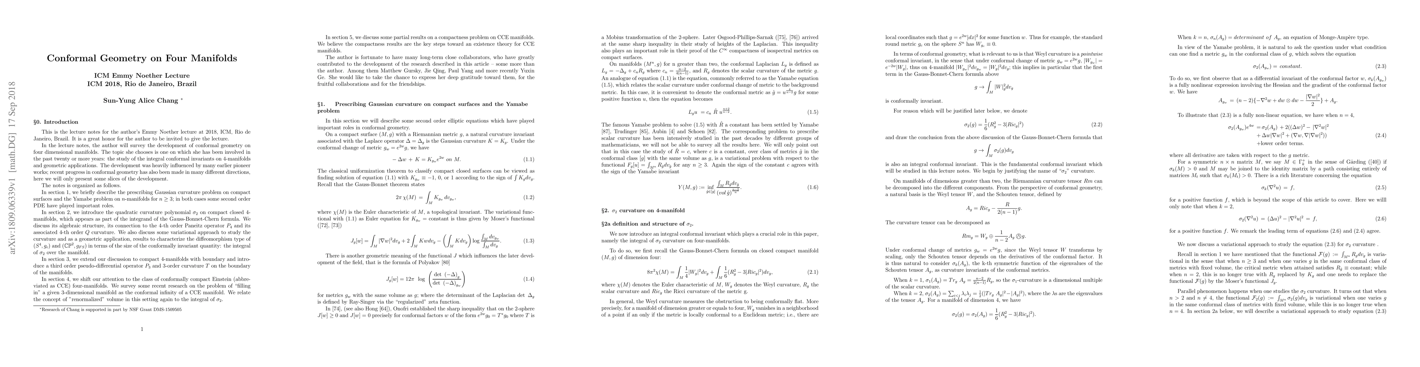 In the lecture notes, the author will survey the development of conformal geometry on four dimensional manifolds. The topic she chooses is one on which she has been involved in the past twenty or more years: the study of the integral conformal invariants on 4-manifolds and geometric applications. The development was heavily influenced by many earlier pioneer works; recent progress in conformal geometry has also been made in many different directions, here we will only present some slices of the development.