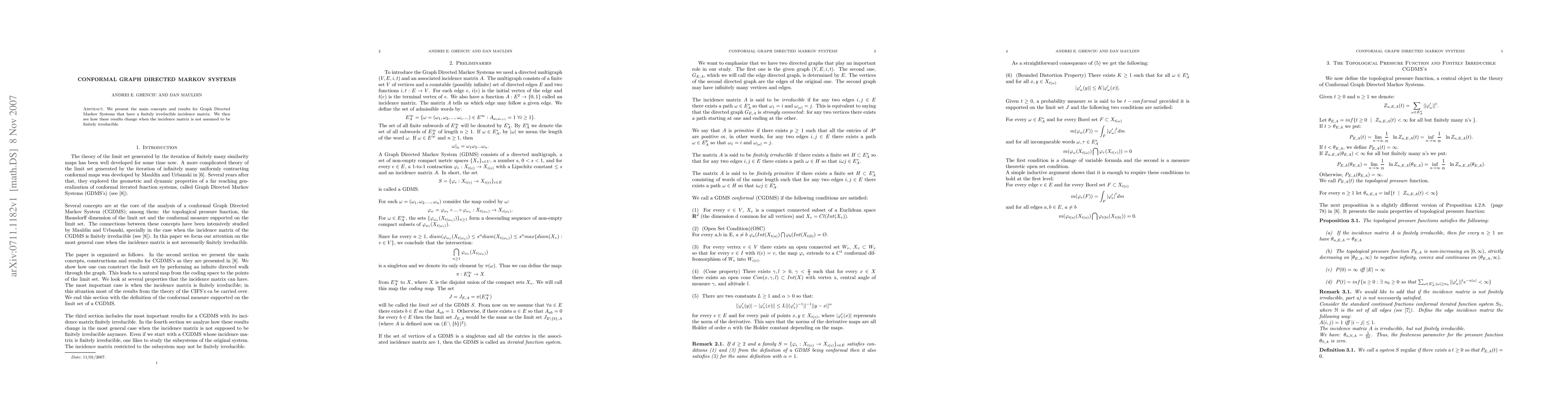Summary: This paper explores Graph Directed Markov Systems with a finitely irreducible incidence matrix, detailing its main concepts and results, and then examines how these findings shift when the incidence matrix lacks finite irreducibility.