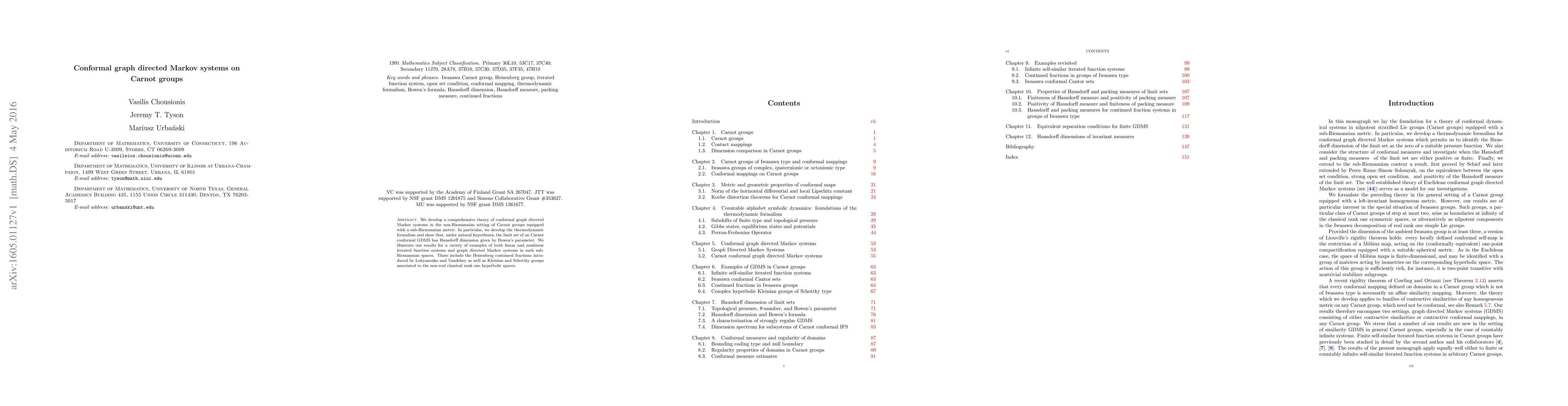 This paper develops a theory for conformal graph directed Markov systems on Carnot groups, establishing thermodynamic formalism and showing that the Hausdorff dimension of the limit set is determined by Bowen's parameter. Examples include Heisenberg continued fractions and Kleinian/Schottky groups in non-real classical rank one hyperbolic spaces.