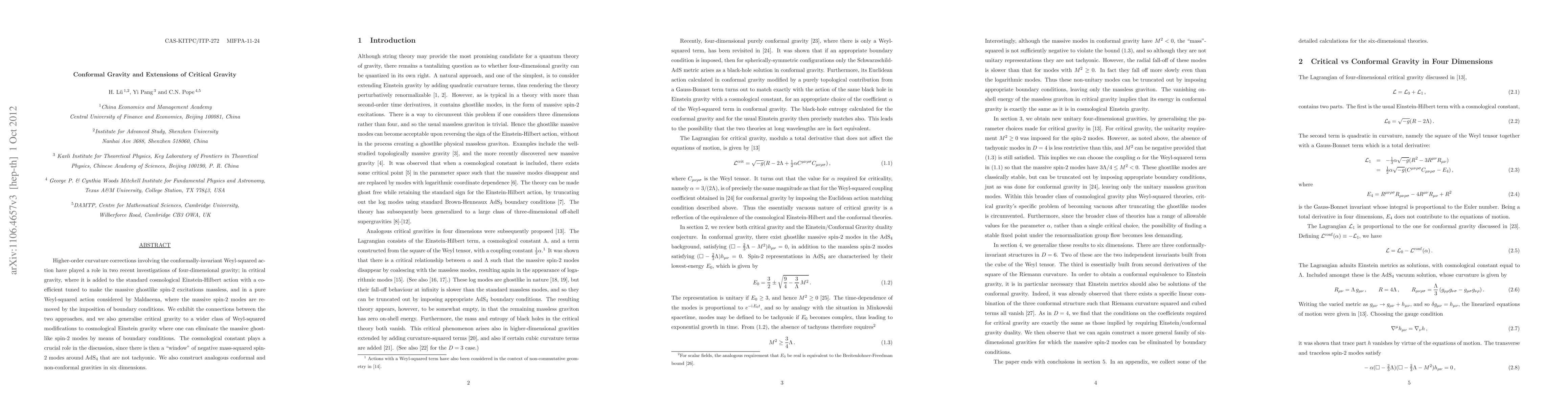 Higher-order curvature corrections involving the conformally-invariant Weyl-squared action have played a role in two recent investigations of four-dimensional gravity; in critical gravity, where it is added to the standard cosmological Einstein-Hilbert action with a coefficient tuned to make the massive ghostlike spin-2 excitations massless, and in a pure Weyl-squared action considered by Maldacena, where the massive spin-2 modes are removed by the imposition of boundary conditions. We exhibit the connections between the two approaches, and we also generalise critical gravity to a wider class of Weyl-squared modifications to cosmological Einstein gravity where one can eliminate the massive ghostlike spin-2 modes by means of boundary conditions. The cosmological constant plays a crucial role in the discussion, since there is then a "window" of negative mass-squared spin-2 modes around AdS_4 that are not tachyonic. We also construct analogous conformal and non-conformal gravities in six dimensions.