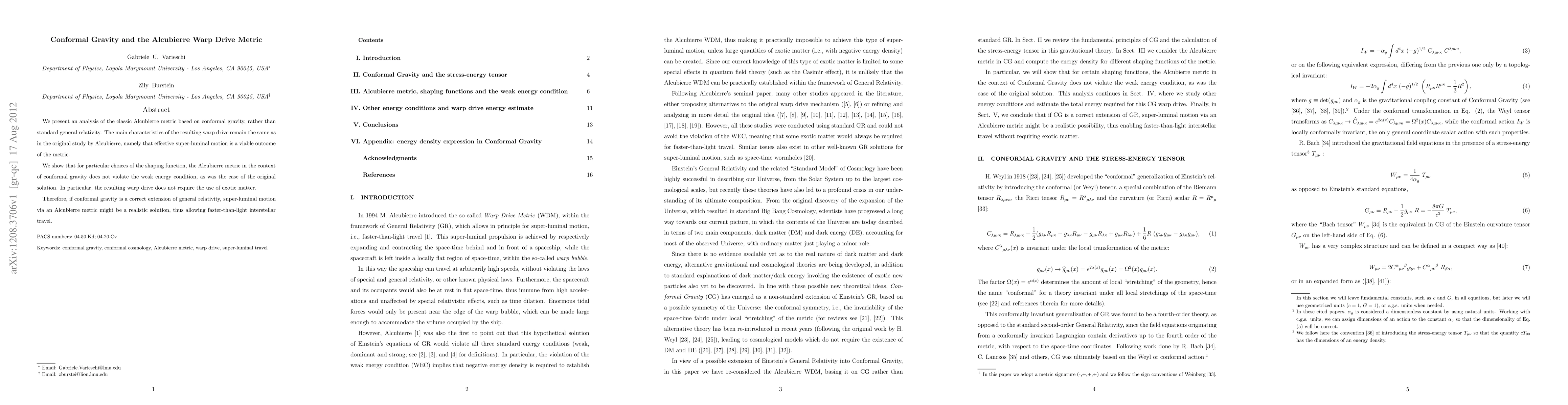 This paper analyzes the Alcubierre warp drive metric using conformal gravity instead of general relativity, finding that it maintains super-luminal motion without violating the weak energy condition and thus does not require exotic matter, suggesting a potentially realistic approach to faster-than-light travel.