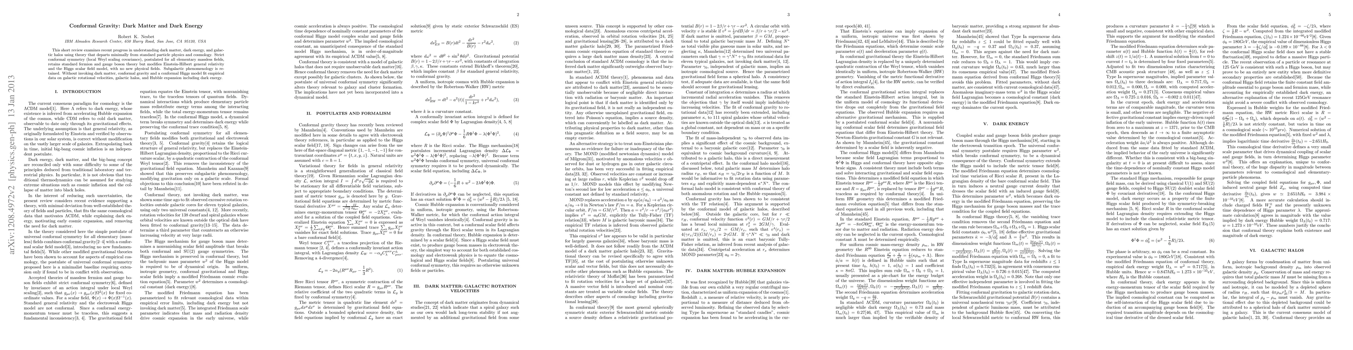 This short review examines recent progress in understanding dark matter, dark energy, and galactic halos using theory that departs minimally from standard particle physics and cosmology. Strict conformal symmetry (local Weyl scaling covariance), postulated for all elementary massless fields, retains standard fermion and gauge boson theory but modifies Einstein-Hilbert general relativity and the Higgs scalar field model, with no new physical fields. Subgalactic phenomenology is retained. Without invoking dark matter, conformal gravity and a conformal Higgs model fit empirical data on galactic rotational velocities, galactic halos, and Hubble expansion including dark energy.
