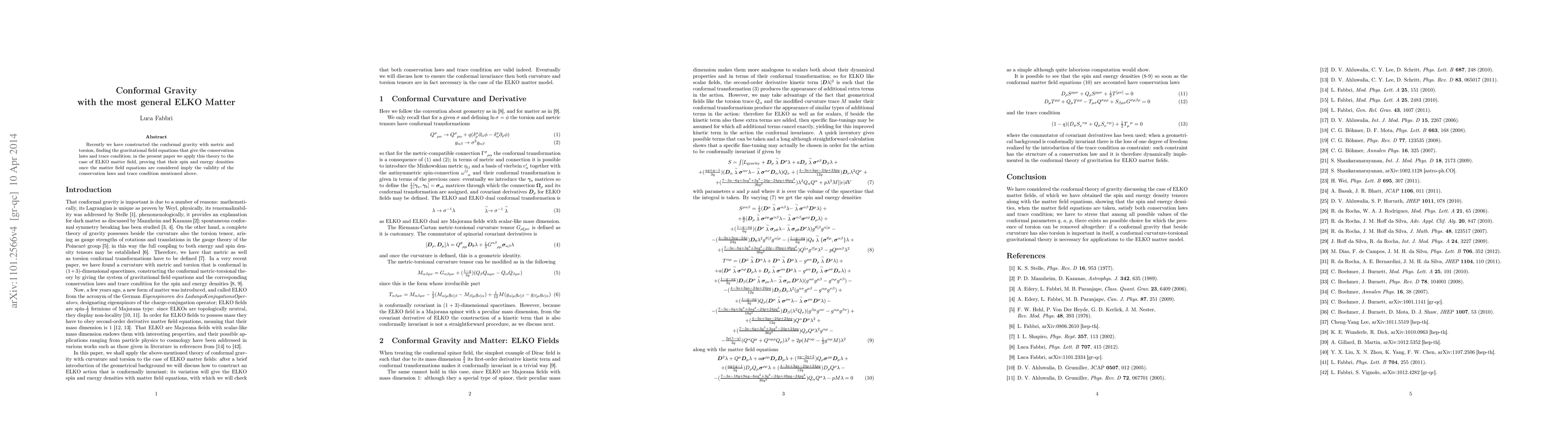 This paper extends conformal gravity to include the most general ELKO (Einstein-Lagrange-Kronecker) matter field, demonstrating that the spin and energy densities of ELKO fields satisfy the conservation laws and trace condition derived from the gravitational field equations.