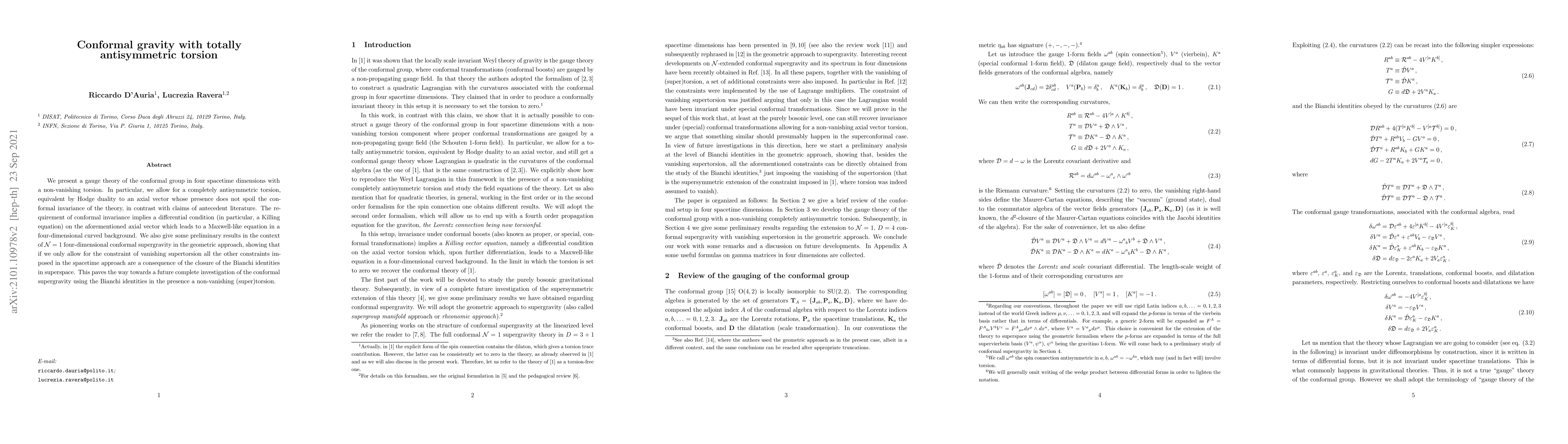We present a gauge theory of the conformal group in four spacetime dimensions with a non-vanishing torsion. In particular, we allow for a completely antisymmetric torsion, equivalent by Hodge duality to an axial vector whose presence does not spoil the conformal invariance of the theory, in contrast with claims of antecedent literature. The requirement of conformal invariance implies a differential condition (in particular, a Killing equation) on the aforementioned axial vector which leads to a Maxwell-like equation in a four-dimensional curved background. We also give some preliminary results in the context of $\mathcal{N}=1$ four-dimensional conformal supergravity in the geometric approach, showing that if we only allow for the constraint of vanishing supertorsion all the other constraints imposed in the spacetime approach are a consequence of the closure of the Bianchi identities in superspace. This paves the way towards a future complete investigation of the conformal supergravity using the Bianchi identities in the presence a non-vanishing (super)torsion.