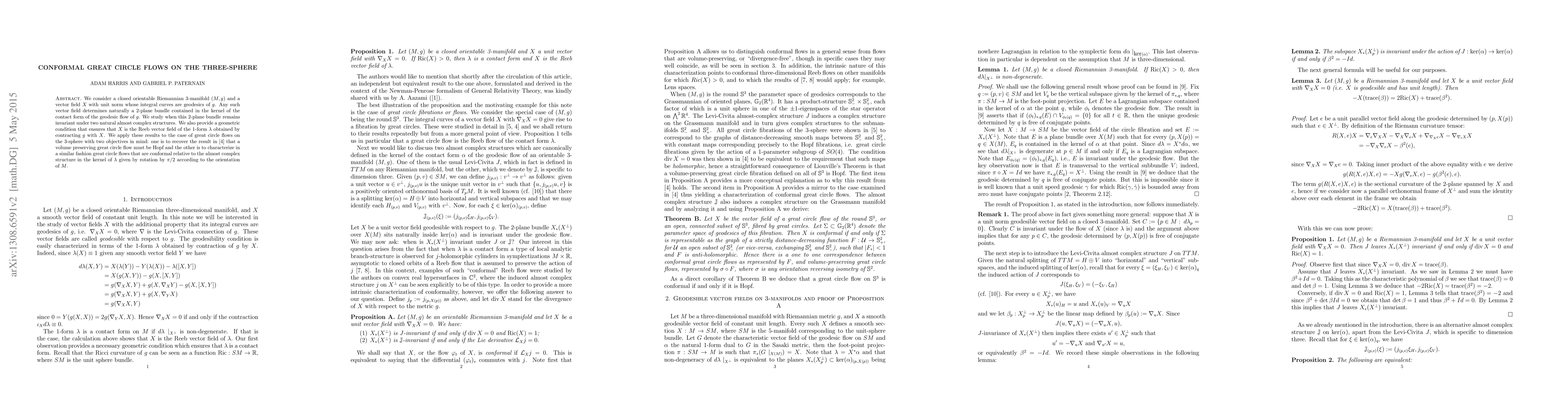 We consider a closed orientable Riemannian 3-manifold $(M,g)$ and a vector field $X$ with unit norm whose integral curves are geodesics of $g$. Any such vector field determines naturally a 2-plane bundle contained in the kernel of the contact form of the geodesic flow of $g$. We study when this 2-plane bundle remains invariant under two natural almost complex structures. We also provide a geometric condition that ensures that $X$ is the Reeb vector field of the 1-form $\lambda$ obtained by contracting $g$ with $X$. We apply these results to the case of great circle flows on the 3-sphere with two objectives in mind: one is to recover the result in \cite{GG} that a volume preserving great circle flow must be Hopf and the other is to characterize in a similar fashion great circle flows that are conformal relative to the almost complex structure in the kernel of $\lambda$ given by rotation by $\pi/2$ according to the orientation of $M$.