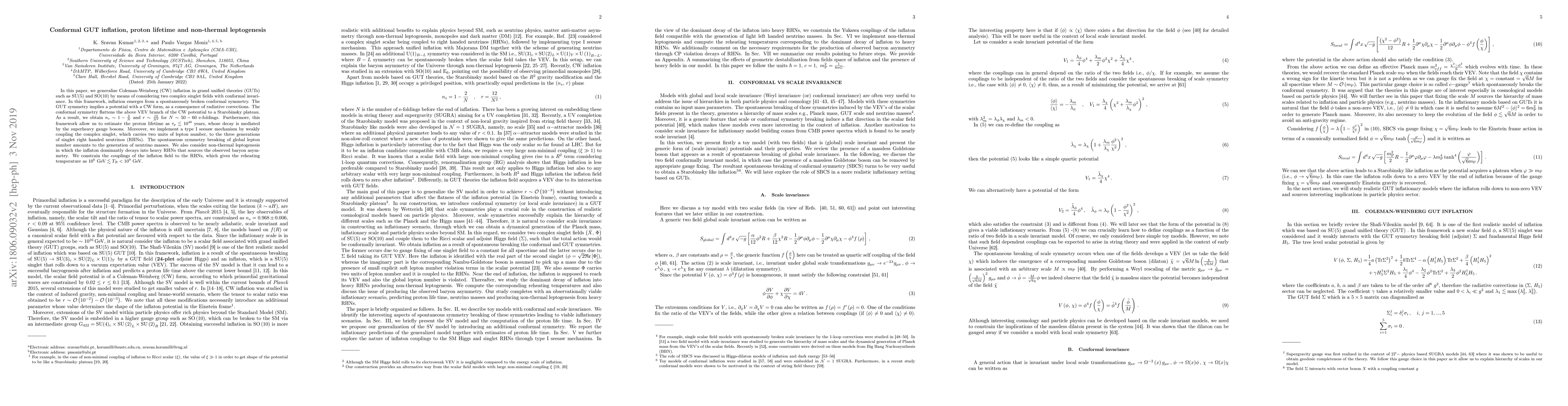 In this paper, we generalize Coleman-Weinberg (CW) inflation in grand unified theories (GUTs) such as $\text{SU}(5)$ and $\text{SO}(10)$ by means of considering two complex singlet fields with conformal invariance. In this framework, inflation emerges from a spontaneously broken conformal symmetry. The GUT symmetry implies a potential with a CW form, as a consequence of radiative corrections. The conformal symmetry flattens the above VEV branch of the CW potential to a Starobinsky plateau. As a result, we obtain $n_{s}\sim 1-\frac{2}{N}$ and $r\sim \frac{12}{N^2}$ for $N\sim 50-60$ e-foldings. Furthermore, this framework allow us to estimate the proton lifetime as $\tau_{p}\lesssim 10^{40}$ years, whose decay is mediated by the superheavy gauge bosons. Moreover, we implement a type I seesaw mechanism by weakly coupling the complex singlet, which carries two units of lepton number, to the three generations of singlet right handed neutrinos (RHNs). The spontaneous symmetry breaking of global lepton number amounts to the generation of neutrino masses. We also consider non-thermal leptogenesis in which the inflaton dominantly decays into heavy RHNs that sources the observed baryon asymmetry. We constrain the couplings of the inflaton field to the RHNs, which gives the reheating temperature as $10^{6}\text{ GeV}\lesssim T_{R}<10^{9}$ GeV.