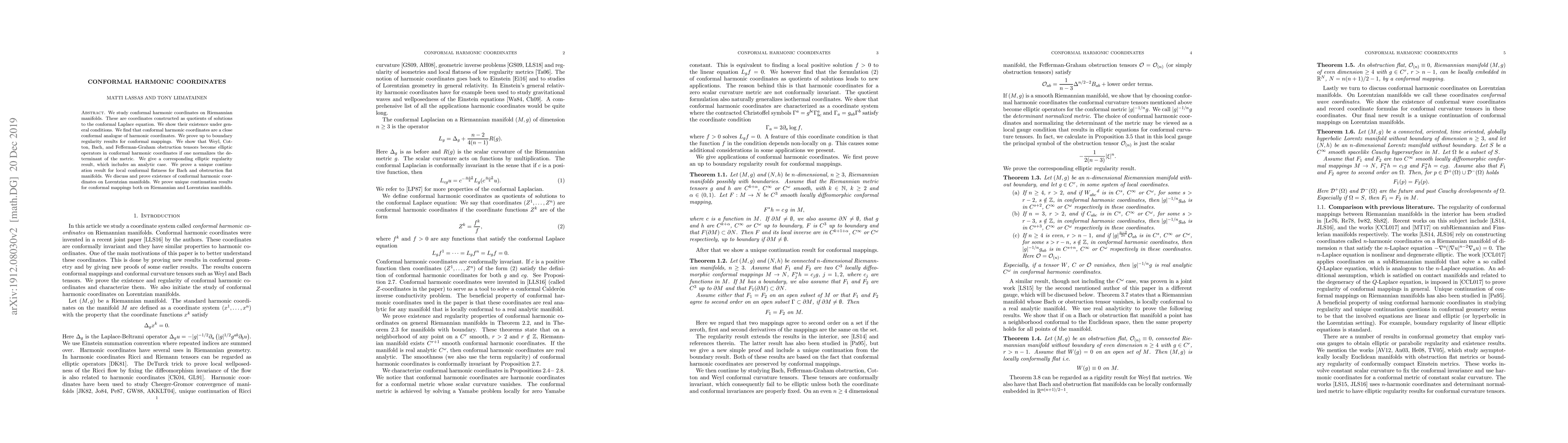This paper investigates conformal harmonic coordinates on Riemannian and Lorentzian manifolds, demonstrating their existence and properties. It shows that these coordinates simplify the analysis of various obstruction tensors and proves unique continuation results for conformal mappings and local conformal flatness.