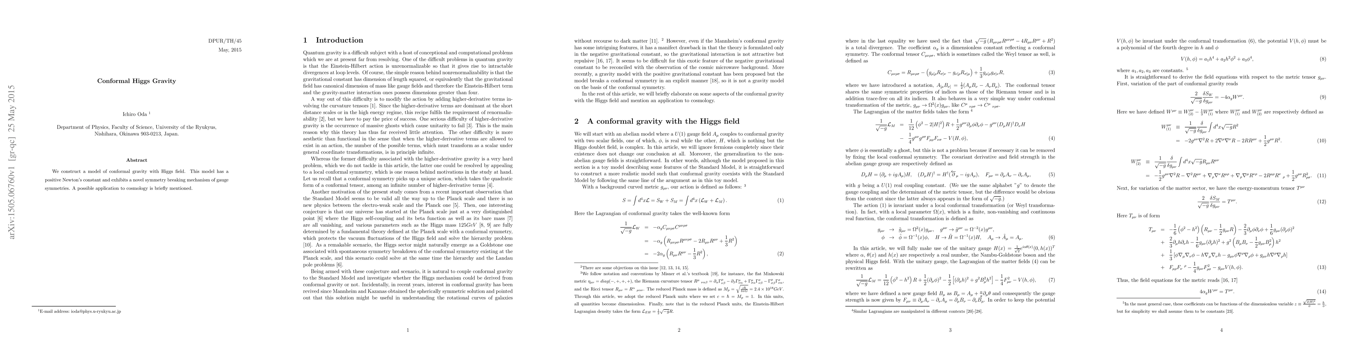 Summary: This paper constructs a conformal gravity model incorporating a Higgs field, showcasing a unique symmetry breaking mechanism and a positive Newton's constant, with a potential application to cosmology.