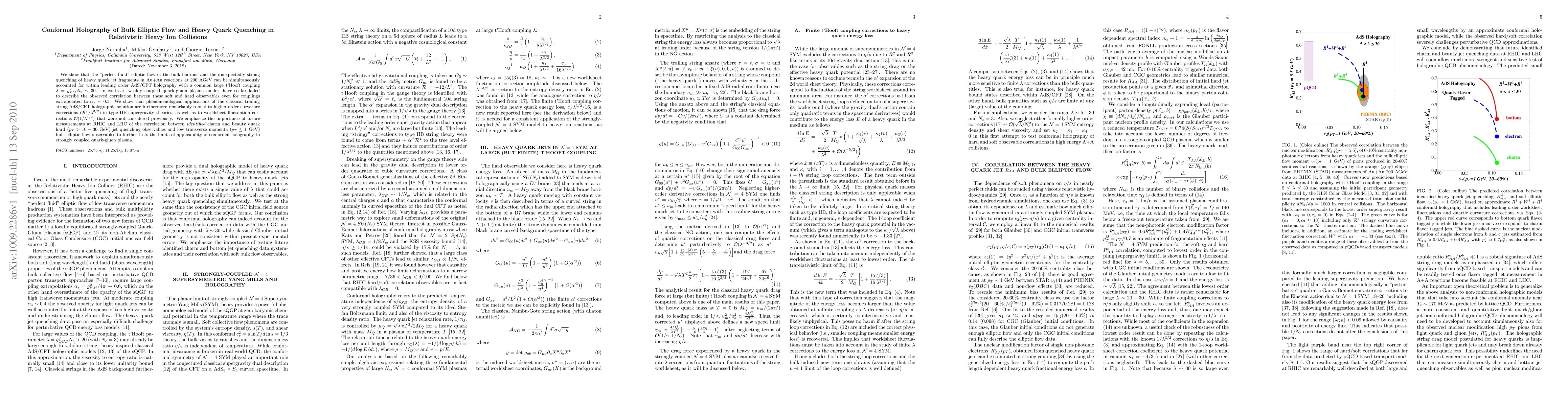 We show that the ``perfect fluid'' elliptic flow of the bulk hadrons and the unexpectedly strong quenching of heavy quark jet fragments in Au+Au reactions at 200 AGeV can be simultaneously accounted for within leading order AdS/CFT holography with a common large t'Hooft coupling $\lambda=g^2_{YM} N_c \sim 30$. In contrast, weakly coupled quark-gluon plasma models have so far failed to describe the observed correlation between these soft and hard observables even for couplings extrapolated to $\alpha_s\sim 0.5$. We show that phenomenological applications of the classical trailing string AdS/CFT holographic solution are furthermore remarkably robust to higher order curvature corrections $\mathcal{O}(1/\lambda^{3/2})$ in type IIB supergravity theories, as well as to worldsheet fluctuation corrections $\mathcal{O}(1/\lambda^{1/2})$ that were not considered previously. We emphasize the importance of future measurements at RHIC and LHC of the correlation between {\em identified} charm and beauty quark hard ($p_T > 10-30$ GeV) jet quenching observables and low transverse momenta ($p_T\le 1$ GeV) bulk elliptic flow observables to further tests the limits of applicability of conformal holography to strongly coupled quark-gluon plasma.
