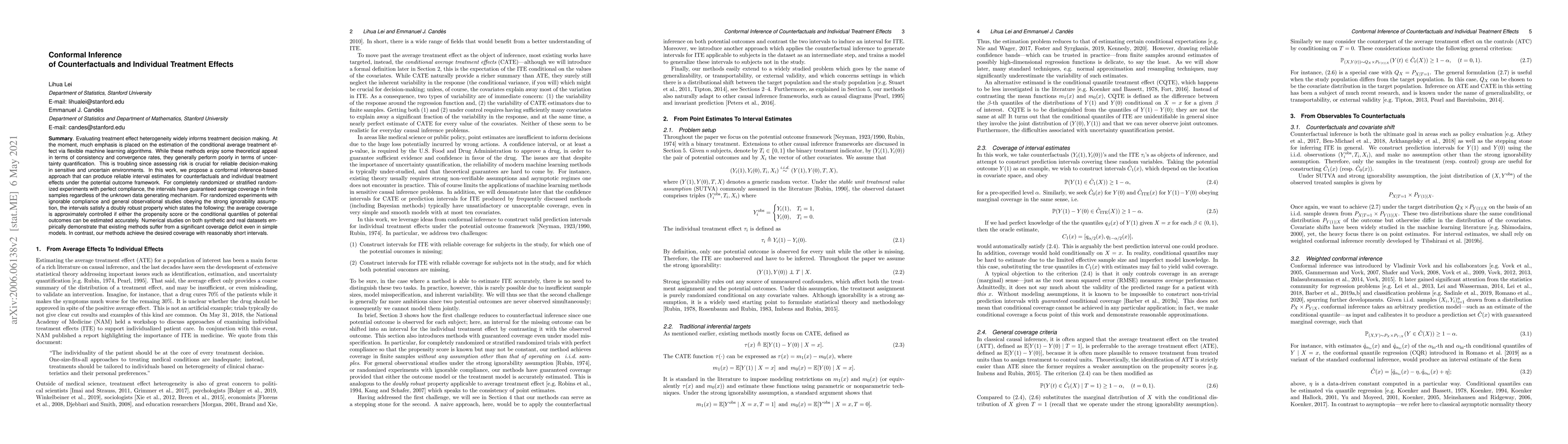 The paper proposes a conformal inference-based approach for producing reliable interval estimates of counterfactuals and individual treatment effects under the potential outcome framework. It ensures average coverage in finite samples for completely randomized or stratified randomized experiments with perfect compliance. For experiments with ignorable compliance and observational studies under the strong ignorability assumption, the intervals are doubly robust, maintaining average coverage if either the propensity score or conditional quantiles of potential outcomes are accurately estimated.