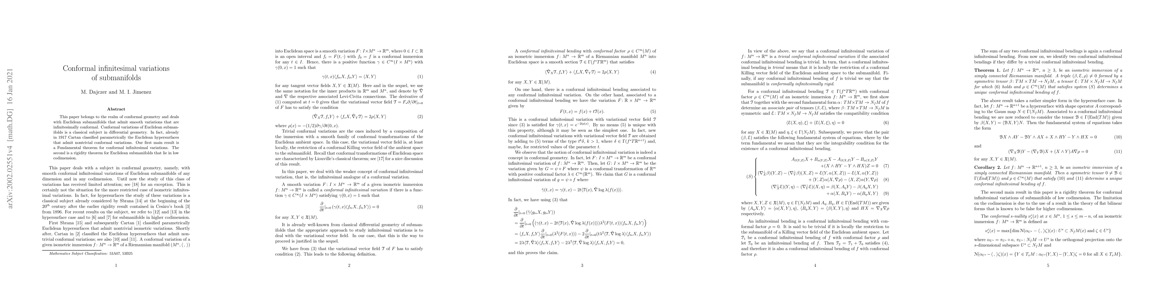 The work extends and refines earlier results by Cartan, providing new theorems and a more comprehensive analysis of conformal infinitesimal variations of Euclidean submanifolds, including a rigidity theorem for submanifolds in low codimension.