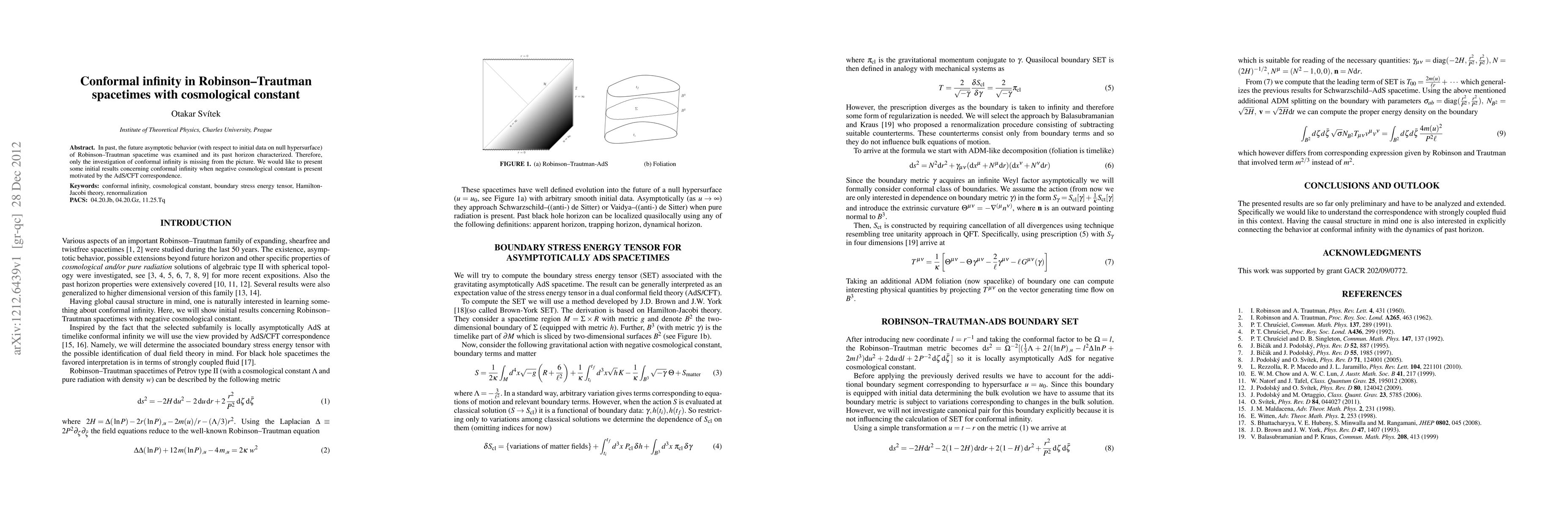 In past, the future asymptotic behavior (with respect to initial data on null hypersurface) of Robinson-Trautman spacetime was examined and its past horizon characterized. Therefore, only the investigation of conformal infinity is missing from the picture. We would like to present some initial results concerning conformal infinity when negative cosmological constant is present motivated by the AdS/CFT correspondence.