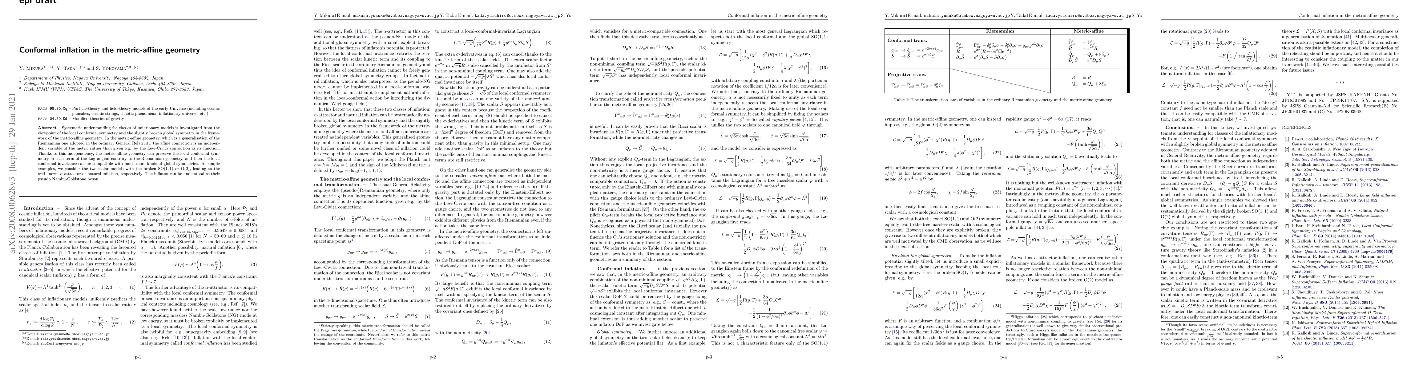 This paper explores inflationary models under the metric-affine geometry, emphasizing local conformal symmetry and slightly broken global symmetry. Unlike Riemannian geometry, metric-affine geometry's independent affine connection allows for greater compatibility with various global symmetries, exemplified by two-scalar models leading to $\alpha$-attractor or natural inflation.