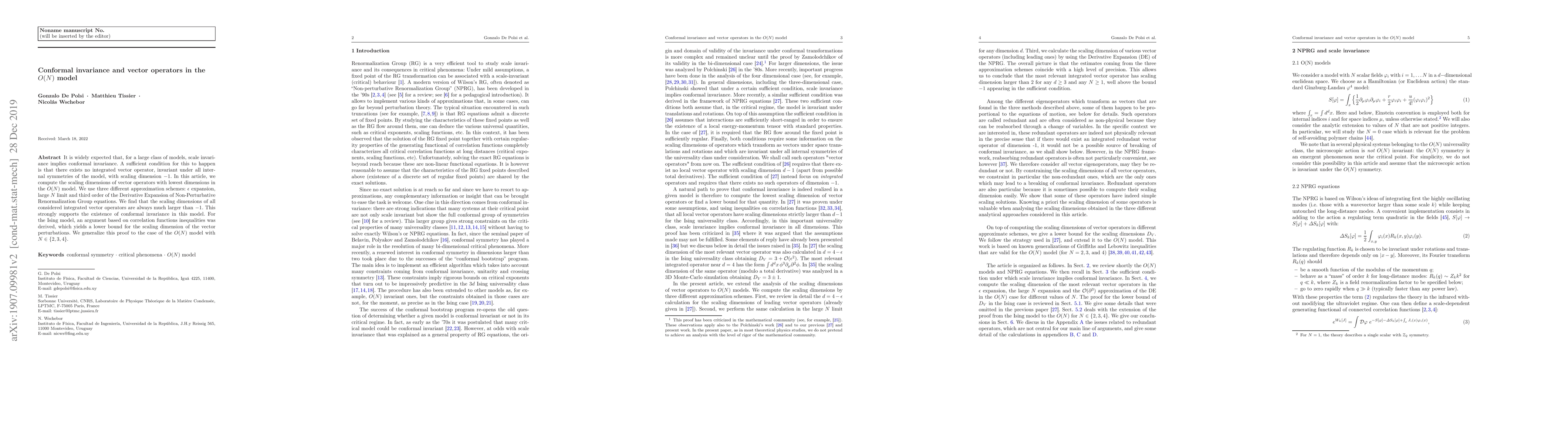 It is widely expected that, for a large class of models, scale invariance implies conformal invariance. A sufficient condition for this to happen is that there exists no integrated vector operator, invariant under all internal symmetries of the model, with scaling dimension $-1$. In this article, we compute the scaling dimensions of vector operators with lowest dimensions in the $O(N)$ model. We use three different approximation schemes: $\epsilon$ expansion, large $N$ limit and third order of the Derivative Expansion of Non-Perturbative Renormalization Group equations. We find that the scaling dimensions of all considered integrated vector operators are always much larger than $-1$. This strongly supports the existence of conformal invariance in this model. For the Ising model, an argument based on correlation functions inequalities was derived, which yields a lower bound for the scaling dimension of the vector perturbations. We generalize this proof to the case of the $O(N)$ model with $N\in \left\lbrace 2,3,4 \right\rbrace$.