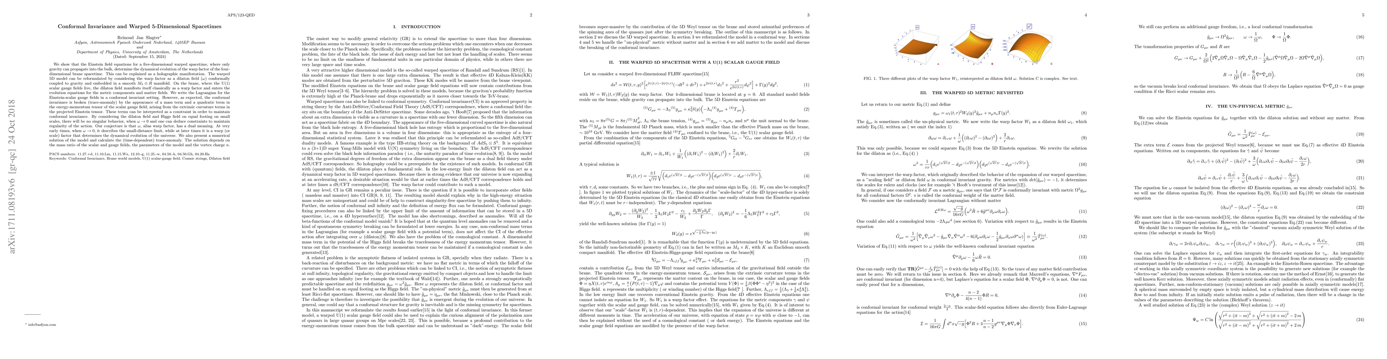 This paper explores the dynamics of a five-dimensional warped spacetime where gravity propagates into the bulk, showing how the Einstein field equations determine the evolution of the warp factor on the four-dimensional brane. The warp factor is reformulated as a conformally coupled dilaton field, leading to a Lagrangian for Einstein-scalar gauge fields in a conformally invariant setting, though trace-anomaly breaks this invariance due to mass and quadratic terms in the energy-momentum tensor.