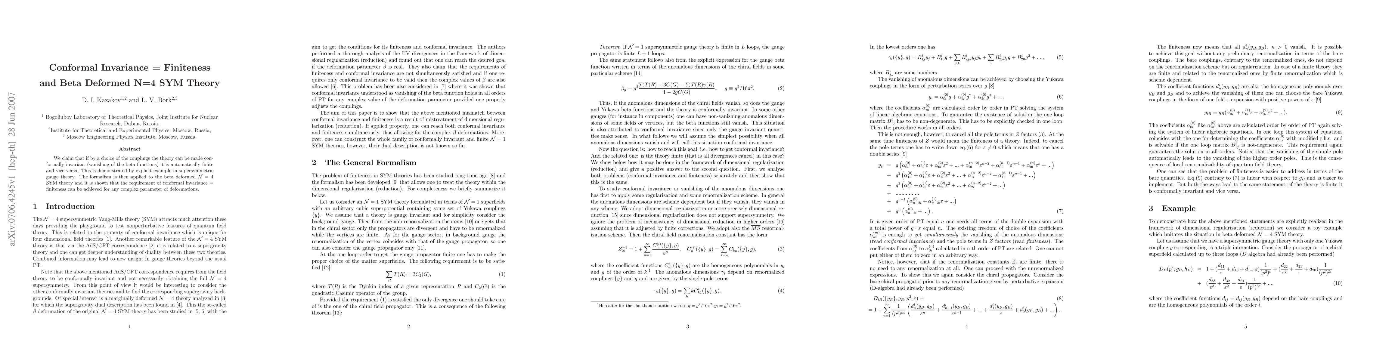 We claim that if by a choice of the couplings the theory can be made conformally invariant (vanishing of the beta functions) it is automatically finite and vice versa. This is demonstrated by explicit example in supersymmetric gauge theory. The formalism is then applied to the beta deformed ${\cal N}=4$ SYM theory and it is shown that the requirement of conformal invariance = finiteness can be achieved for any complex parameter of deformations.