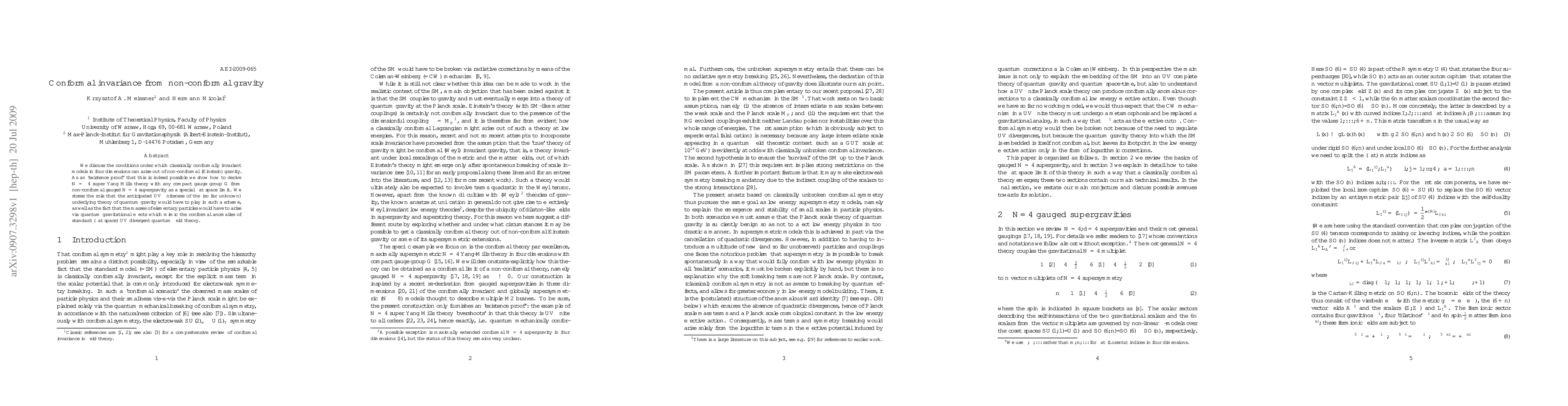 We discuss the conditions under which classically conformally invariant models in four dimensions can arise out of non-conformal (Einstein) gravity. As an `existence proof' that this is indeed possible we show how to derive N=4 super Yang Mills theory with any compact gauge group G from non-conformal gauged N=4 supergravity as a special flat space limit. We stress the role that the anticipated UV finiteness of the (so far unknown) underlying theory of quantum gravity would have to play in such a scheme, as well as the fact that the masses of elementary particles would have to arise via quantum gravitational effects which mimic the conformal anomalies of standard (flat space) UV divergent quantum field theory.