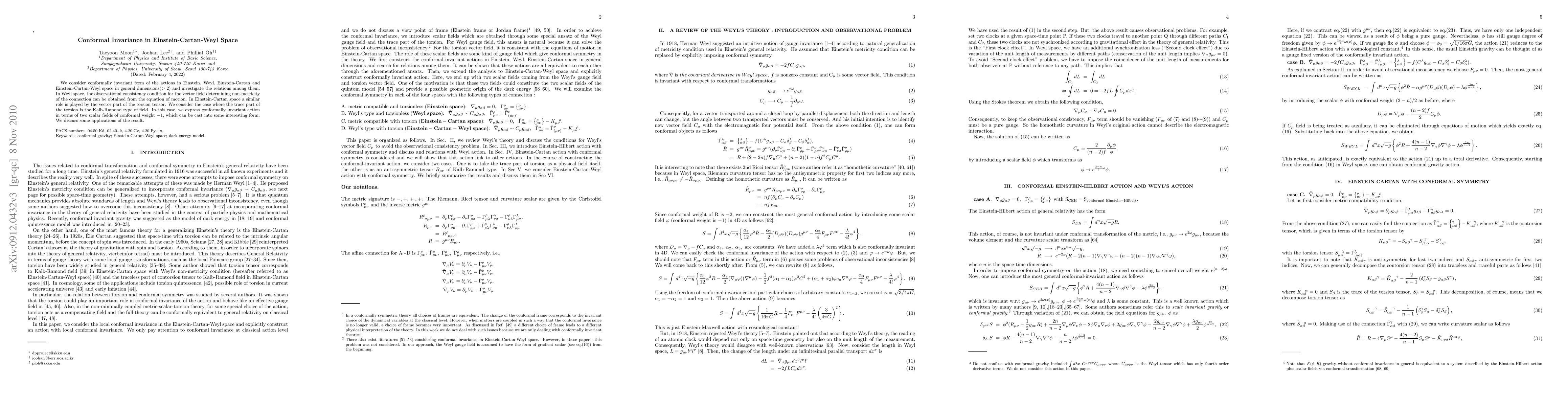 This paper explores the conformally invariant forms of actions in Einstein, Weyl, Einstein-Cartan, and Einstein-Cartan-Weyl spaces in dimensions greater than 2, investigating their interrelations. It highlights the role of vector fields and torsion in maintaining observational consistency and presents a conformally invariant action expressed in terms of two scalar fields.
