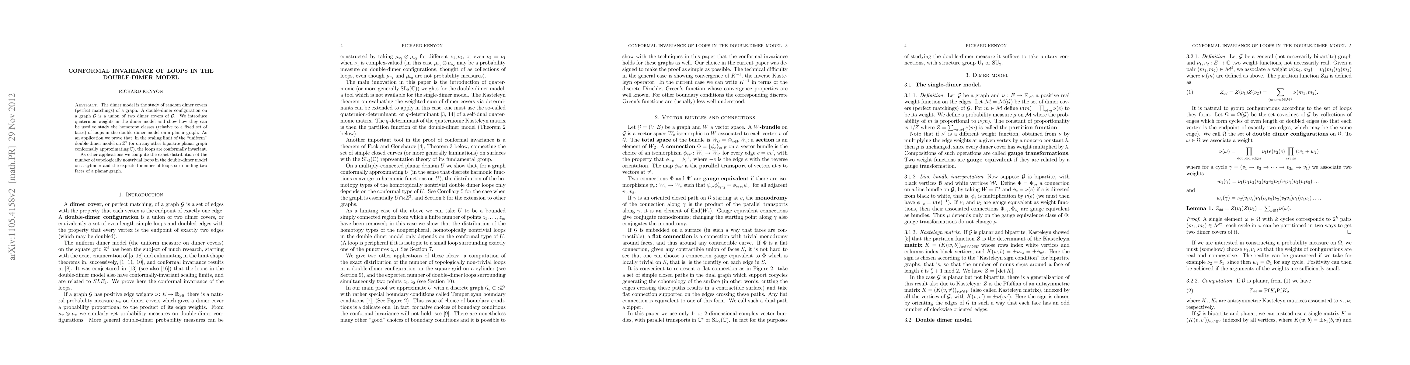 The dimer model is the study of random dimer covers (perfect matchings) of a graph. A double-dimer configuration on a graph $G$ is a union of two dimer covers of $G$. We introduce quaternion weights in the dimer model and show how they can be used to study the homotopy classes (relative to a fixed set of faces) of loops in the double dimer model on a planar graph. As an application we prove that, in the scaling limit of the "uniform" double-dimer model on ${\mathbb Z}^2$ (or on any other bipartite planar graph conformally approximating $\mathbb C$), the loops are conformally invariant. As other applications we compute the exact distribution of the number of topologically nontrivial loops in the double-dimer model on a cylinder and the expected number of loops surrounding two faces of a planar graph.