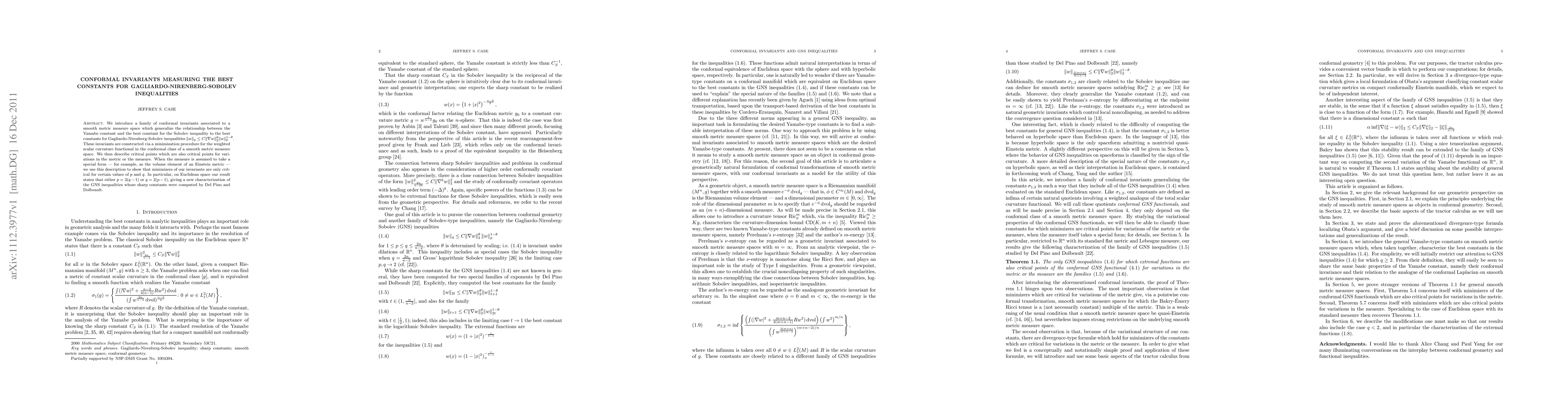 This paper introduces conformal invariants linked to smooth metric measure spaces that generalize the relationship between the Yamabe constant and the best constant for Sobolev inequalities to Gagliardo-Nirenberg-Sobolev inequalities. The invariants are derived from minimizing the weighted scalar curvature functional, leading to critical points that are also critical for variations in the metric or measure, and provide a new characterization of sharp constants for these inequalities on Euclidean space.