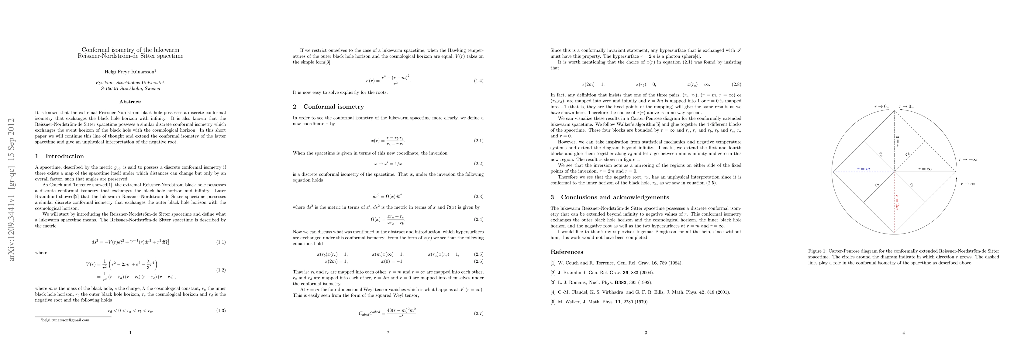 It is known that the extremal Reissner-Nordstr\"om black hole possesses a discrete conformal isometry that exchanges the black hole horizon with infinity. It is also known that the Reissner-Nordstr\"om-de Sitter spacetime posseses a similar discrete conformal isometry which exchanges the event horizon of the black hole with the cosmological horizon. In this short paper we will continue this line of thought and extend the conformal isometry of the latter spacetime and give an unphysical interpretation of the negative root.
