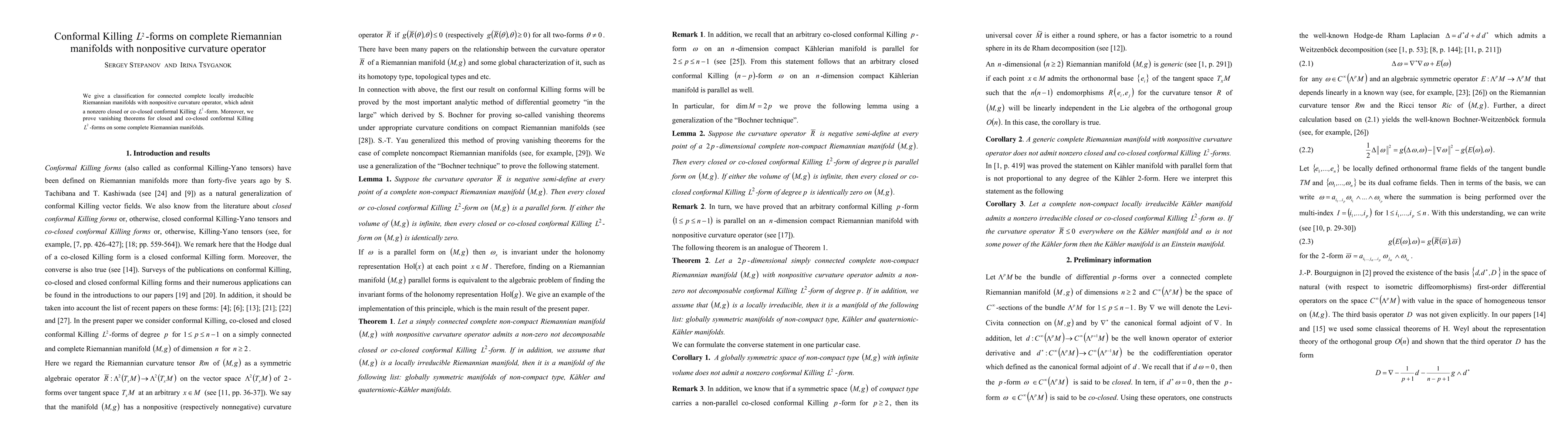 This paper classifies connected complete locally irreducible Riemannian manifolds with nonpositive curvature that allow a nonzero closed or co-closed conformal Killing $L^{2}$-form, and proves vanishing theorems for these forms under certain conditions.