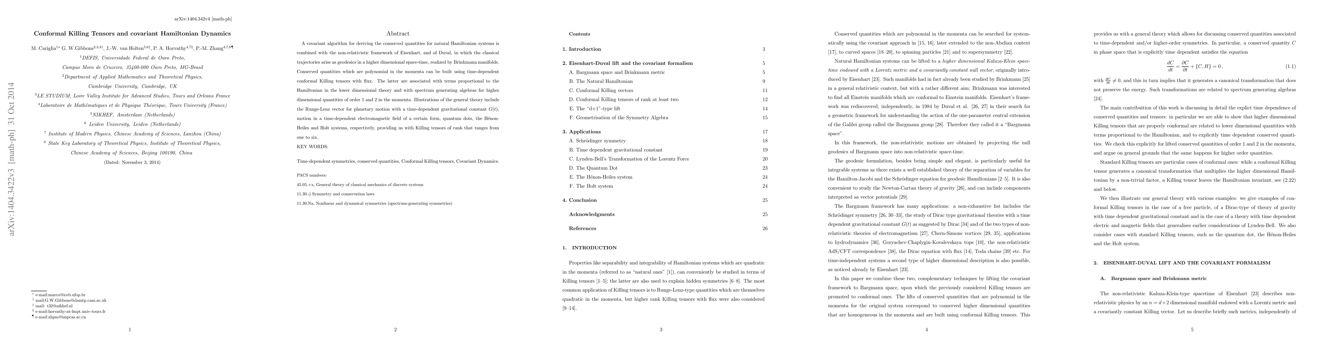 A covariant algorithm for deriving the conserved quantities for natural Hamiltonian systems is combined with the non-relativistic framework of Eisenhart, and of Duval, in which the classical trajectories arise as geodesics in a higher dimensional space-time, realized by Brinkmann manifolds. Conserved quantities which are polynomial in the momenta can be built using time-dependent conformal Killing tensors with flux. The latter are associated with terms proportional to the Hamiltonian in the lower dimensional theory and with spectrum generating algebras for higher dimensional quantities of order $1$ and $2$ in the momenta. Illustrations of the general theory include the Runge-Lenz vector for planetary motion with a time-dependent gravitational constant $G(t)$, motion in a time-dependent electromagnetic field of a certain form, quantum dots, the H\'enon-Heiles and Holt systems, respectively, providing us with Killing tensors of rank that ranges from one to six.