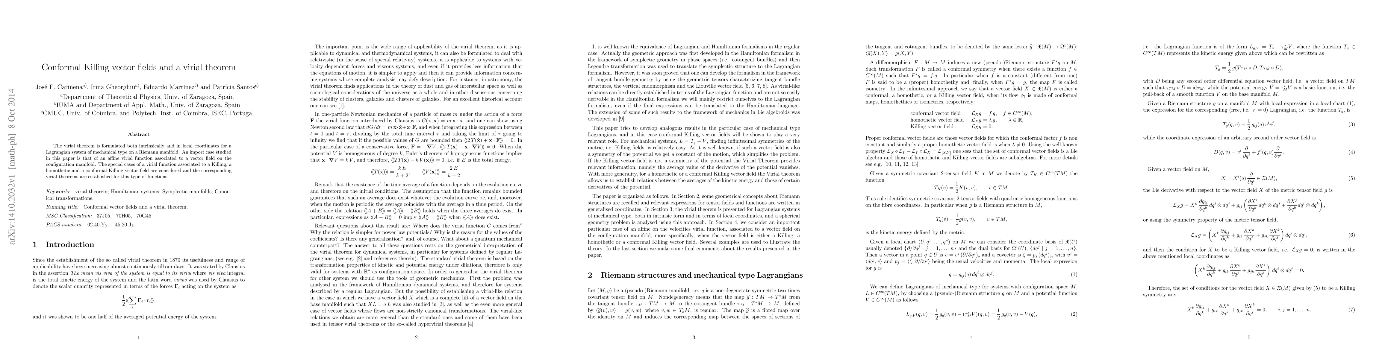 The virial theorem is formulated both intrinsically and in local coordinates for a Lagrangian system of mechanical type on a Riemann manifold. An import case studied in this paper is that of an affine virial function associated to a vector field on the configuration manifold. The special cases of a virial function associated to a Killing, a homothetic and a conformal Killing vector field are considered and the corresponding virial theorems are established for this type of functions.