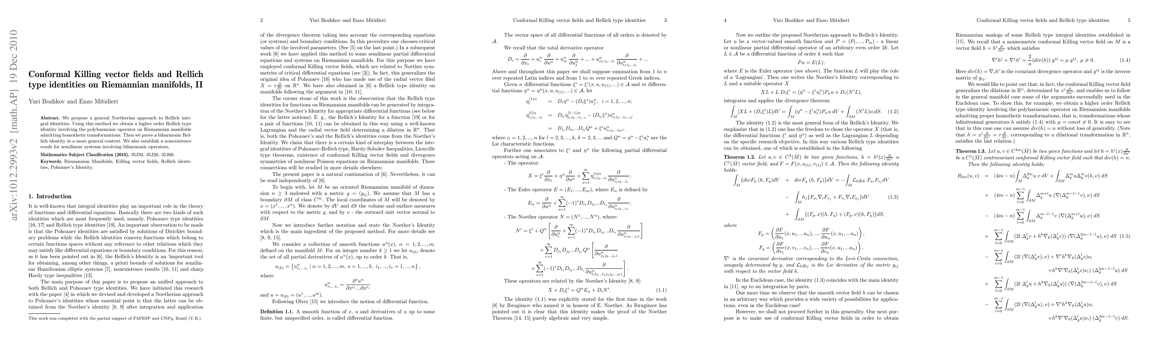 We propose a general Noetherian approach to Rellich integral identities. Using this method we obtain a higher order Rellich type identity involving the polyharmonic operator on Riemannian manifolds admitting homothetic transformations. Then we prove a biharmonic Rellich identity in a more general context. We also establish a nonexistence result for semilinear systems involving biharmonic operators.