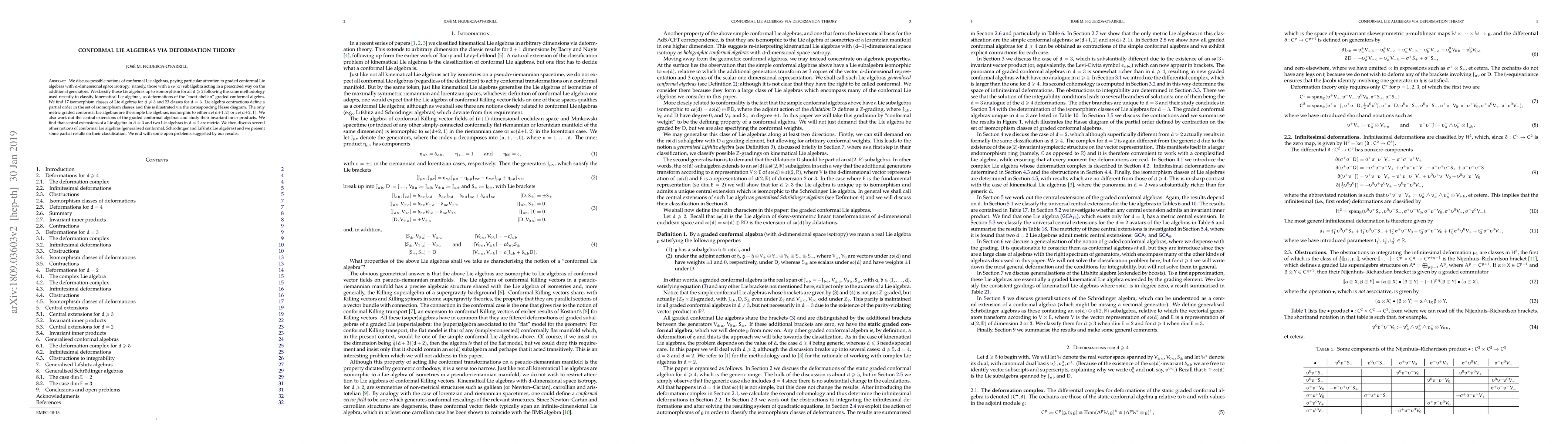 The paper classifies conformal Lie algebras, particularly graded ones with $d$-dimensional isotropy, through deformation theory, identifying 17 isomorphism classes for $d\neq 3$ and 23 for $d=3$. It also examines central extensions and metric properties, concluding with partial results on other conformal Lie algebra types.