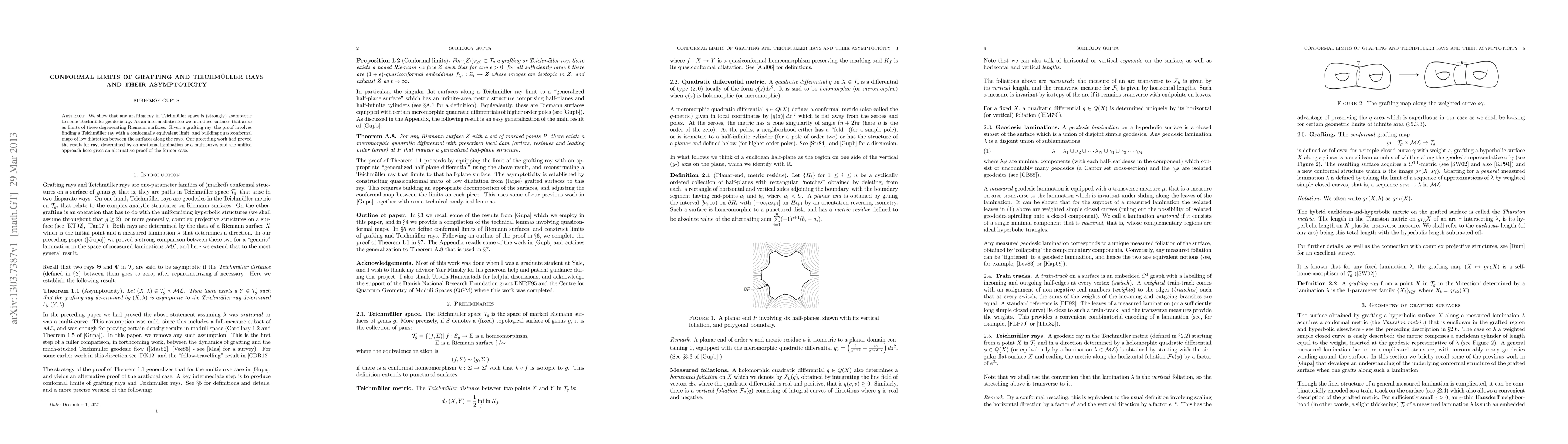 This paper demonstrates that any grafting ray in Teichmüller space strongly approaches a Teichmüller geodesic ray, introducing surfaces that arise as limits of degenerating Riemann surfaces. The proof constructs quasiconformal maps of low dilatation between the surfaces along the rays, providing an alternative proof for the previously established result for rays determined by arational laminations or multicurves.