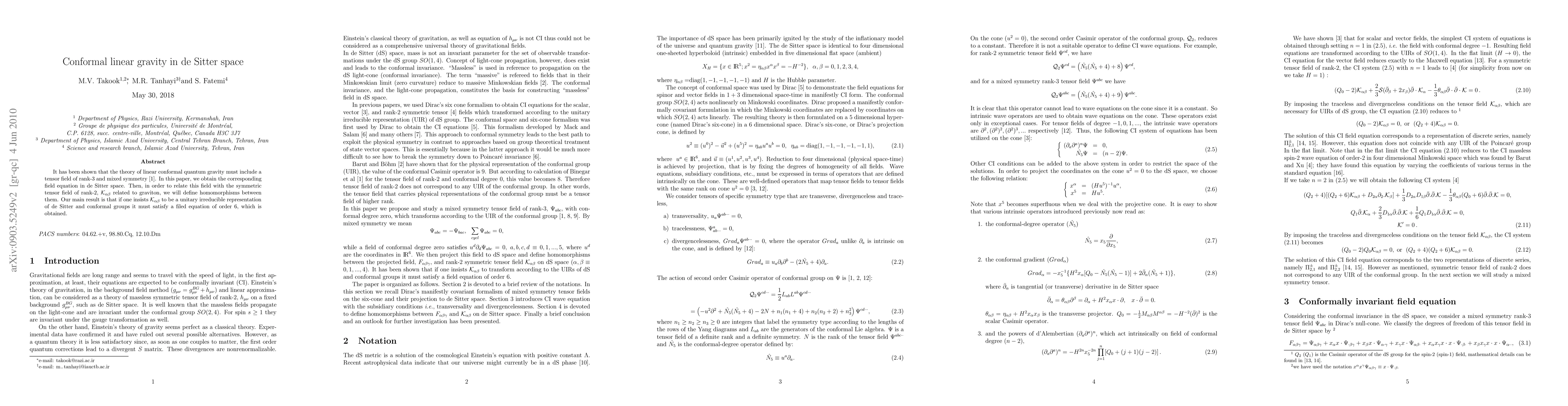 This paper derives the field equation for a rank-3 tensor field in linear conformal quantum gravity within de Sitter space and establishes homomorphisms relating it to a rank-2 symmetric tensor field akin to the graviton. The key finding is that the rank-2 tensor field must satisfy a sixth-order field equation to be a unitary irreducible representation of de Sitter and conformal groups.