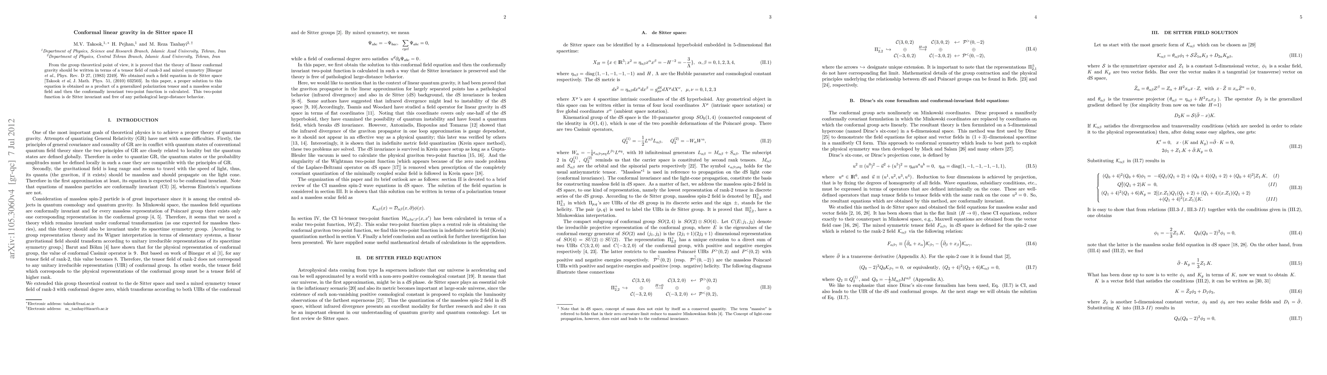 From the group theoretical point of view, it is proved that the theory of linear conformal gravity should be written in terms of a tensor field of rank-3 and mixed symmetry [Binegar, et al, Phys. Rev. D 27, (1983) 2249]. We obtained such a field equation in de Sitter space [Takook, et al, J. Math. Phys. 51, (2010) 032503]. In this paper, a proper solution to this equation is obtained as a product of a generalized polarization tensor and a massless scalar field and then the conformally invariant two-point function is calculated. This two-point function is de Sitter invariant and free of any pathological large-distance behavior.