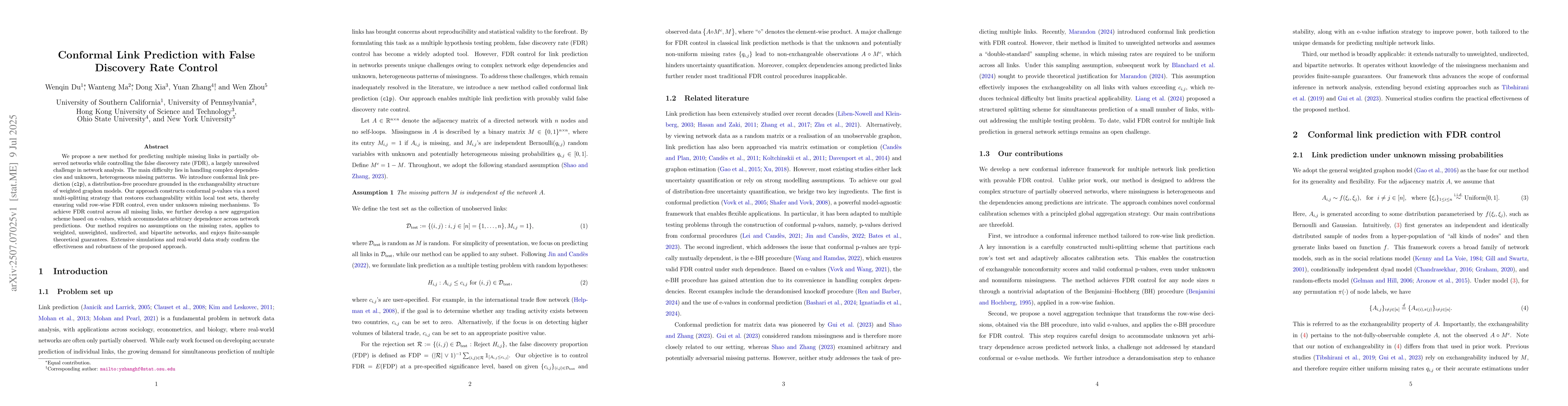 We propose a new method for predicting multiple missing links in partially observed networks while controlling the false discovery rate (FDR), a largely unresolved challenge in network analysis. The main difficulty lies in handling complex dependencies and unknown, heterogeneous missing patterns. We introduce conformal link prediction ({\tt clp}), a distribution-free procedure grounded in the exchangeability structure of weighted graphon models. Our approach constructs conformal p-values via a novel multi-splitting strategy that restores exchangeability within local test sets, thereby ensuring valid row-wise FDR control, even under unknown missing mechanisms. To achieve FDR control across all missing links, we further develop a new aggregation scheme based on e-values, which accommodates arbitrary dependence across network predictions. Our method requires no assumptions on the missing rates, applies to weighted, unweighted, undirected, and bipartite networks, and enjoys finite-sample theoretical guarantees. Extensive simulations and real-world data study confirm the effectiveness and robustness of the proposed approach.