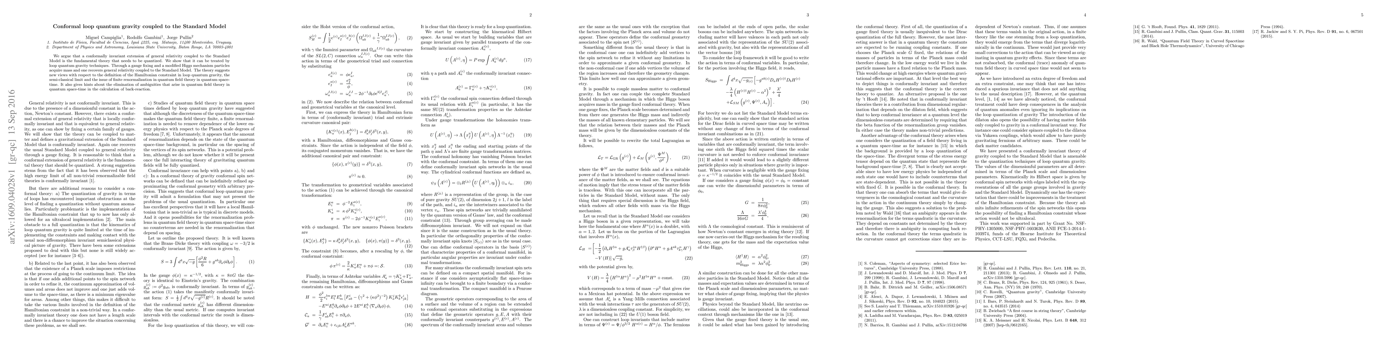 Researchers propose a new theory that combines general relativity with the Standard Model of particle physics, treating it as a conformally invariant extension of general relativity that can be quantized using loop quantum gravity techniques.